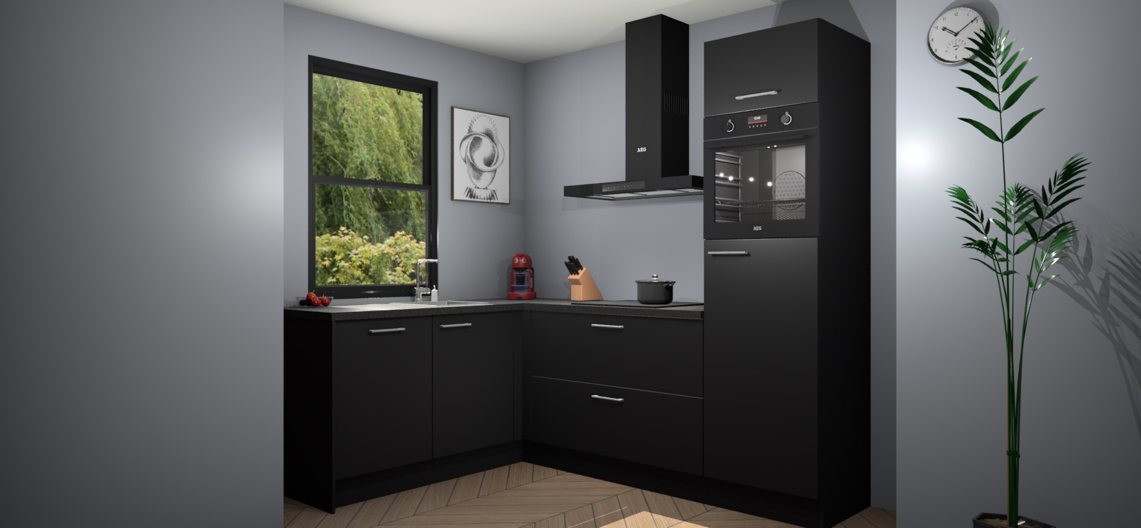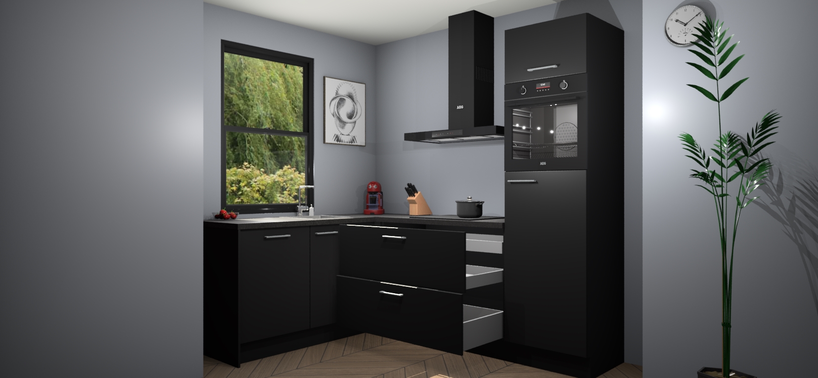 Moedige modernisten! De zwarte keuken Kinshasa is het perfecte antwoord op al uw keukendromen. Dit geraffineerde, tijdloze ontwerp combineert strakke kasten met hoogglans details zodat u die dure look krijgt zonder het dure prijskaartje. We weten dat planning en uitvoering de sleutels zijn tot een geslaagde keukenrenovatie, dus hebben we ervoor gezorgd dat we vijf inbouwapparaten in ons pakket hebben: een oven, inductiekookplaat, afzuigkap, vaatwasser en koelkast. Deze kunnen na bestelling gemakkelijk worden uitgebreid voor nog meer gemak.