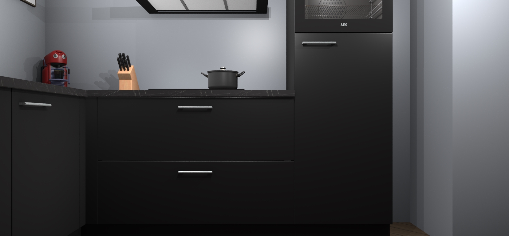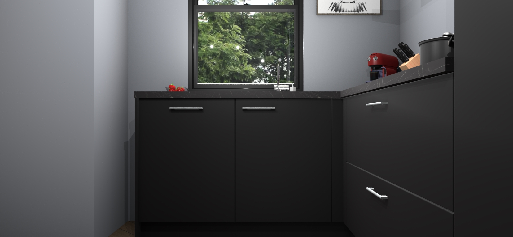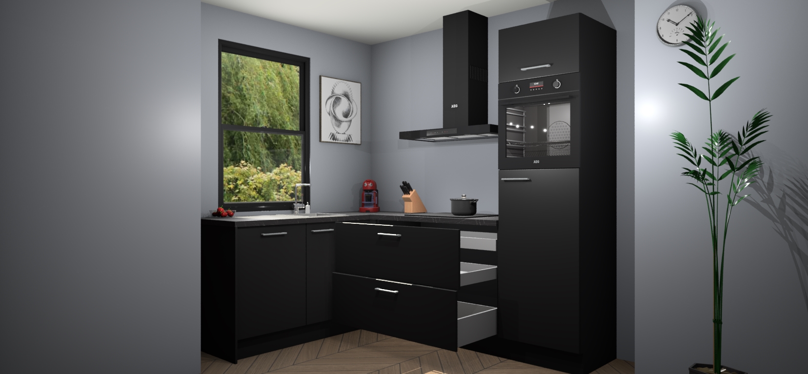 Moedige modernisten! De zwarte keuken Kinshasa is het perfecte antwoord op al uw keukendromen. Dit geraffineerde, tijdloze ontwerp combineert strakke kasten met hoogglans details zodat u die dure look krijgt zonder het dure prijskaartje. We weten dat planning en uitvoering de sleutels zijn tot een geslaagde keukenrenovatie, dus hebben we ervoor gezorgd dat we vijf inbouwapparaten in ons pakket hebben: een oven, inductiekookplaat, afzuigkap, vaatwasser en koelkast. Deze kunnen na bestelling gemakkelijk worden uitgebreid voor nog meer gemak.
