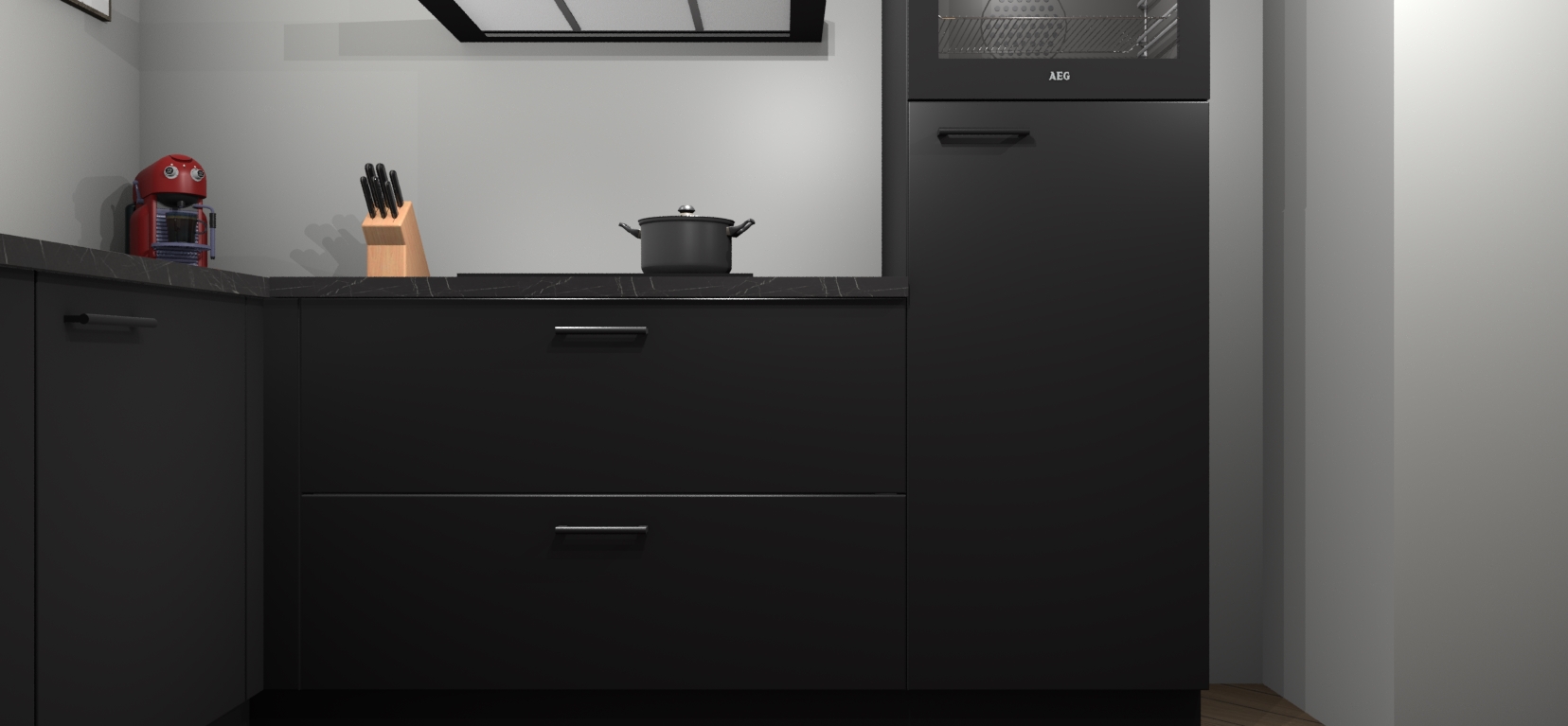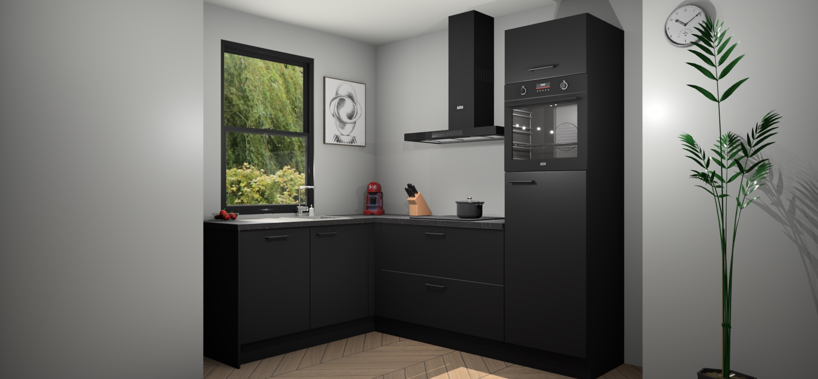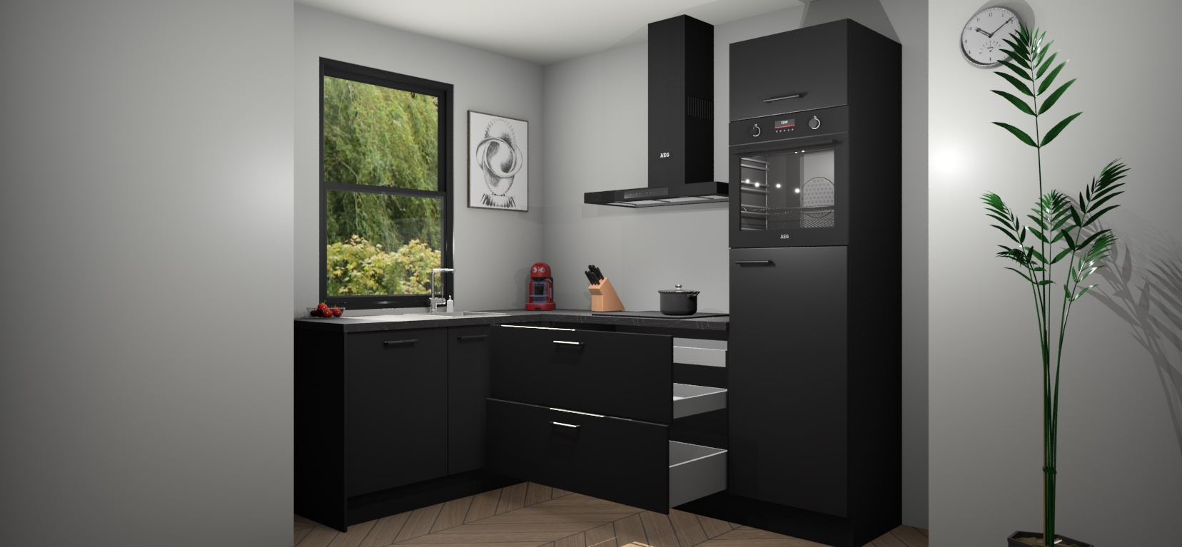 Moedige modernisten! De zwarte keuken Kinshasa is het perfecte antwoord op al uw keukendromen. Dit geraffineerde, tijdloze ontwerp combineert strakke kasten met hoogglans details zodat u die dure look krijgt zonder het dure prijskaartje. We weten dat planning en uitvoering de sleutels zijn tot een geslaagde keukenrenovatie, dus hebben we ervoor gezorgd dat we vijf inbouwapparaten in ons pakket hebben: een oven, inductiekookplaat, afzuigkap, vaatwasser en koelkast. Deze kunnen na bestelling gemakkelijk worden uitgebreid voor nog meer gemak.
