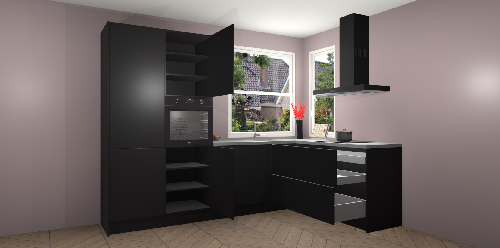 Elke Zwarte keuken Kotor wordt compleet geleverd met vijf inbouwapparaten, waaronder een oven, inductiekookplaat, afzuigkap, vaatwasser en koelkast. Sterker nog - indien gewenst kunt u deze apparaten na bestelling eenvoudig upgraden naar AEG! Extra functies zijn onder andere soft close deuren voor extra gemak, en elke kast wordt voor gemonteerd geleverd zodat u sneller van uw nieuwe keuken kunt genieten.
