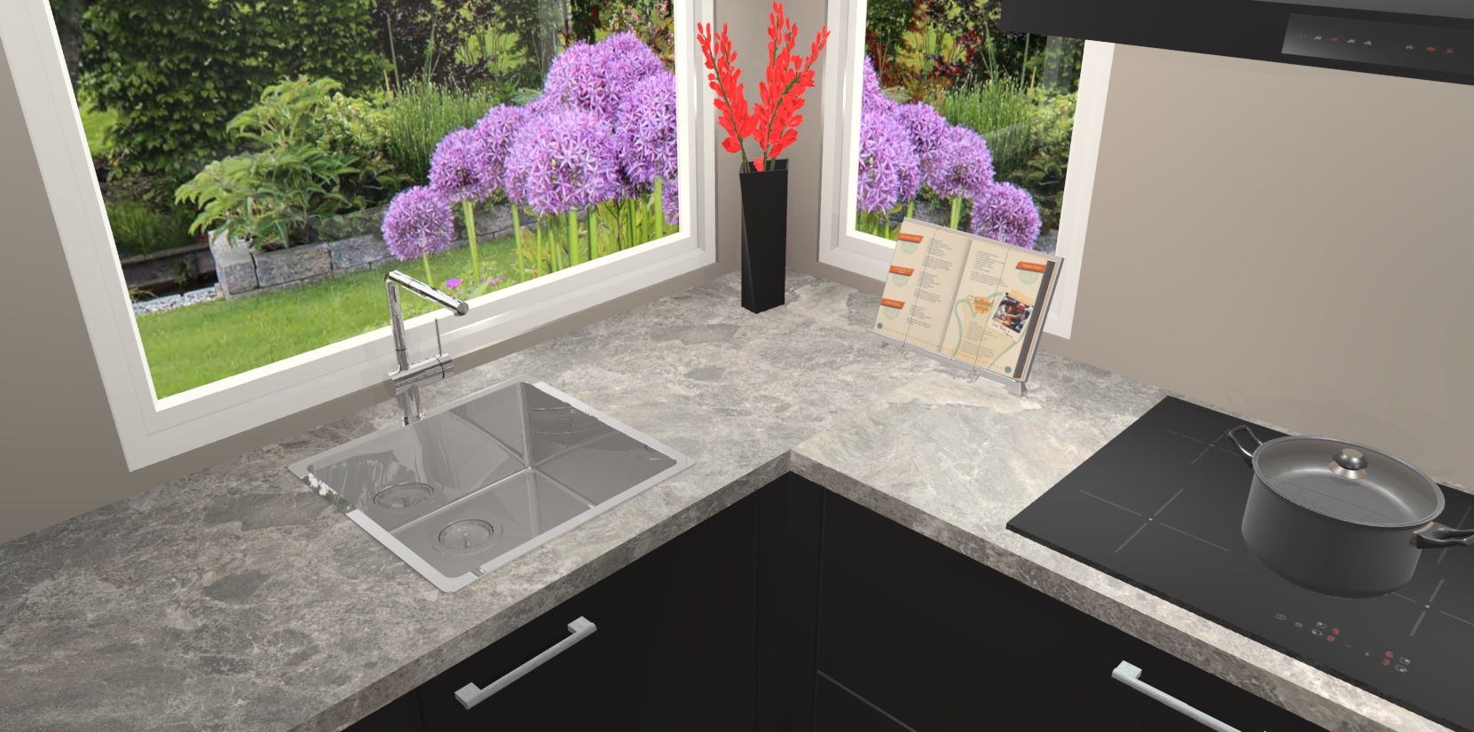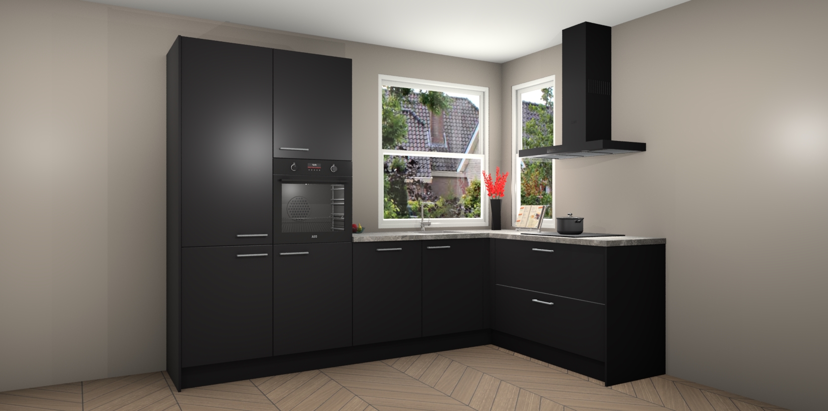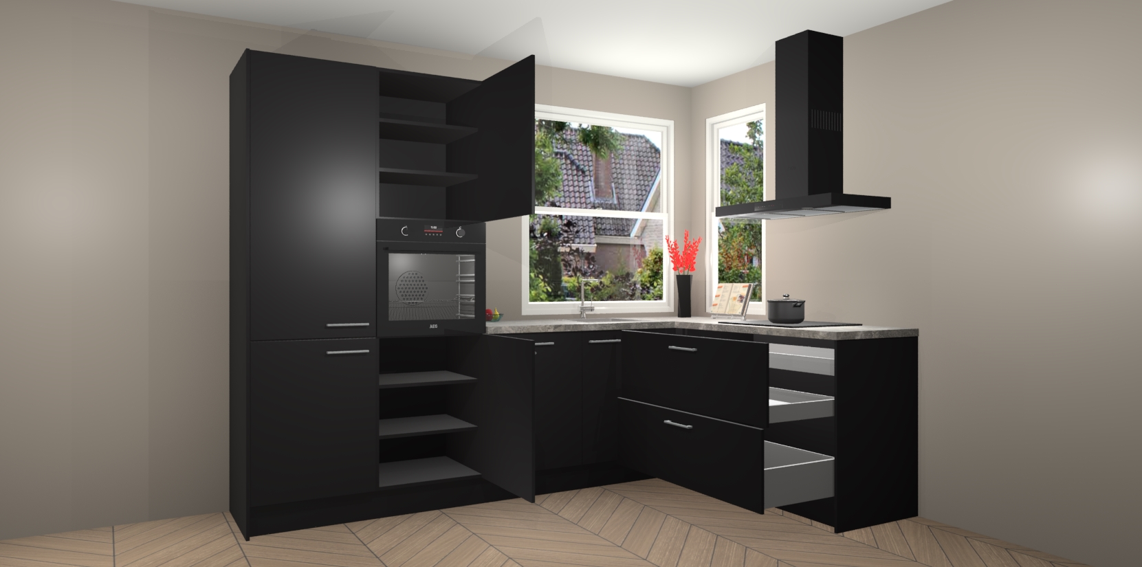 Het is tijd om halsoverkop verliefd te worden op uw droomkeuken, en de Zwarte keuken Kotor is precies wat u nodig heeft! Met een moderne, tijdloze constructie en een mix van prachtig design zal deze luxe hoekkeuken zeker opvallen. Maar laat de schoonheid u niet afleiden van de indrukwekkende functies - want onder dit alles schuilt een onovertroffen hoeveelheid lekkers!