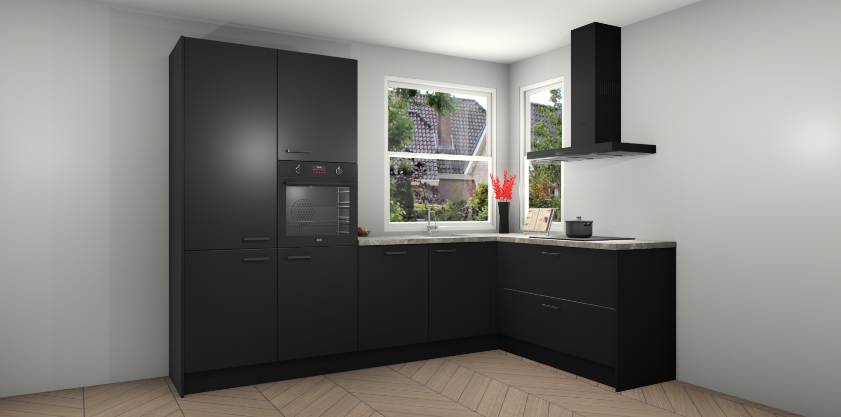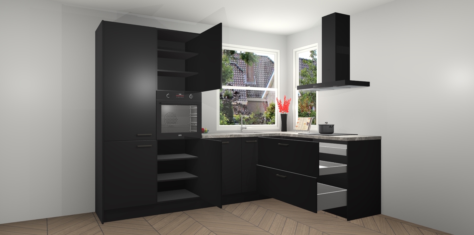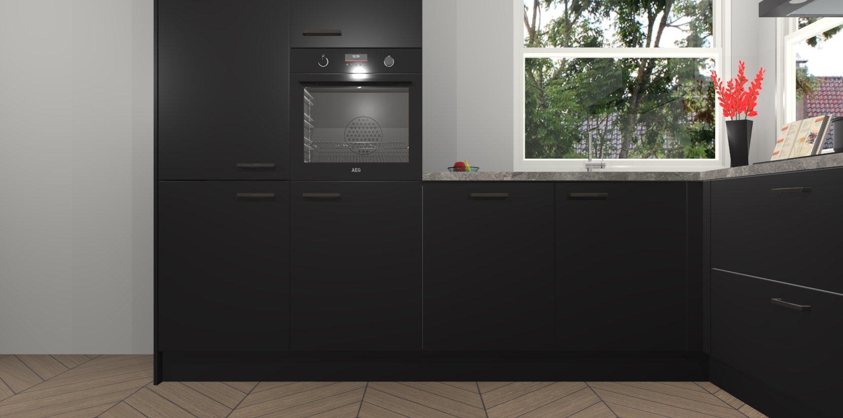 Elke Zwarte keuken Kotor wordt compleet geleverd met vijf inbouwapparaten, waaronder een oven, inductiekookplaat, afzuigkap, vaatwasser en koelkast. Sterker nog - indien gewenst kunt u deze apparaten na bestelling eenvoudig upgraden naar AEG! Extra functies zijn onder andere soft close deuren voor extra gemak, en elke kast wordt voor gemonteerd geleverd zodat u sneller van uw nieuwe keuken kunt genieten.