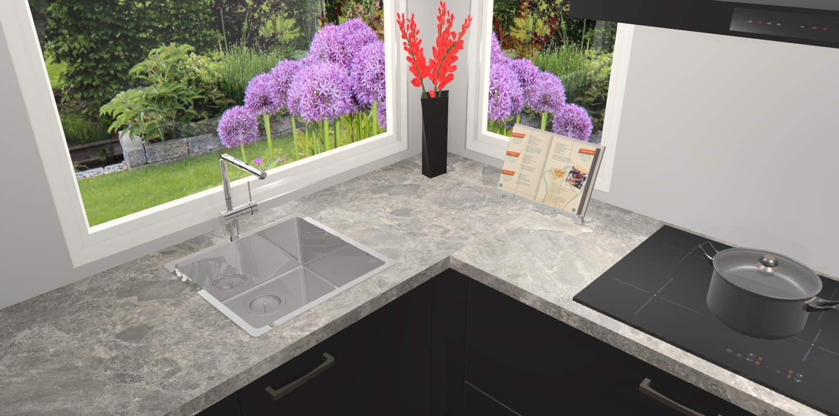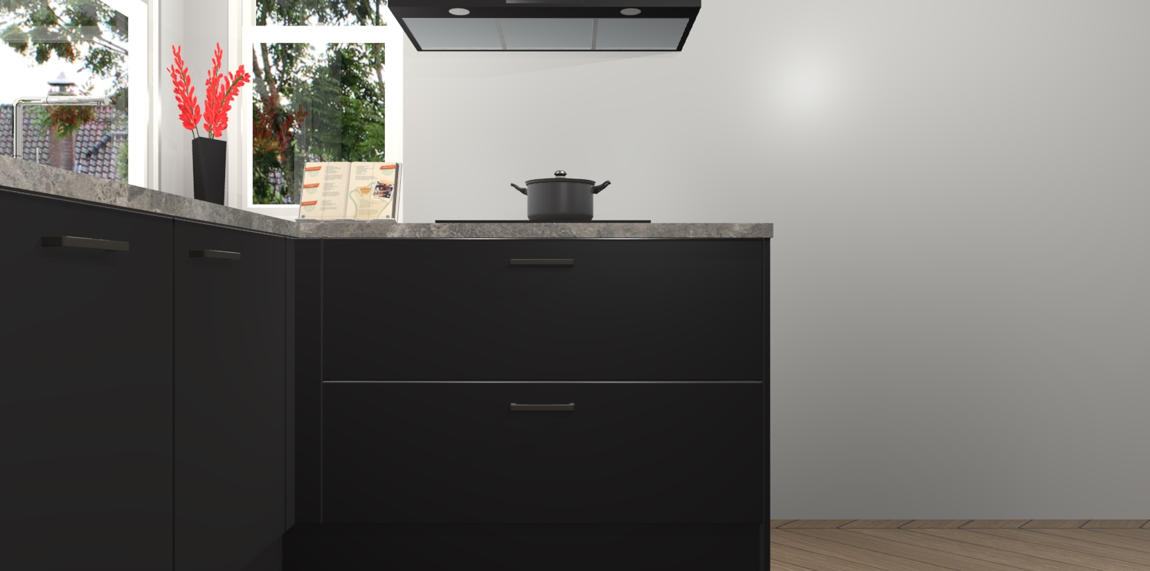 Het is tijd om halsoverkop verliefd te worden op uw droomkeuken, en de Zwarte keuken Kotor is precies wat u nodig heeft! Met een moderne, tijdloze constructie en een mix van prachtig design zal deze luxe hoekkeuken zeker opvallen. Maar laat de schoonheid u niet afleiden van de indrukwekkende functies - want onder dit alles schuilt een onovertroffen hoeveelheid lekkers!