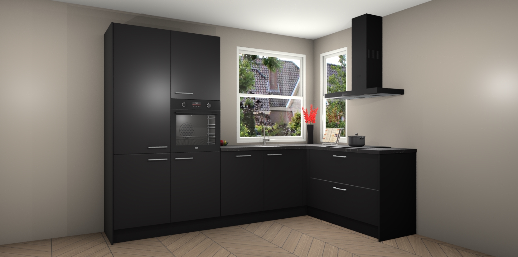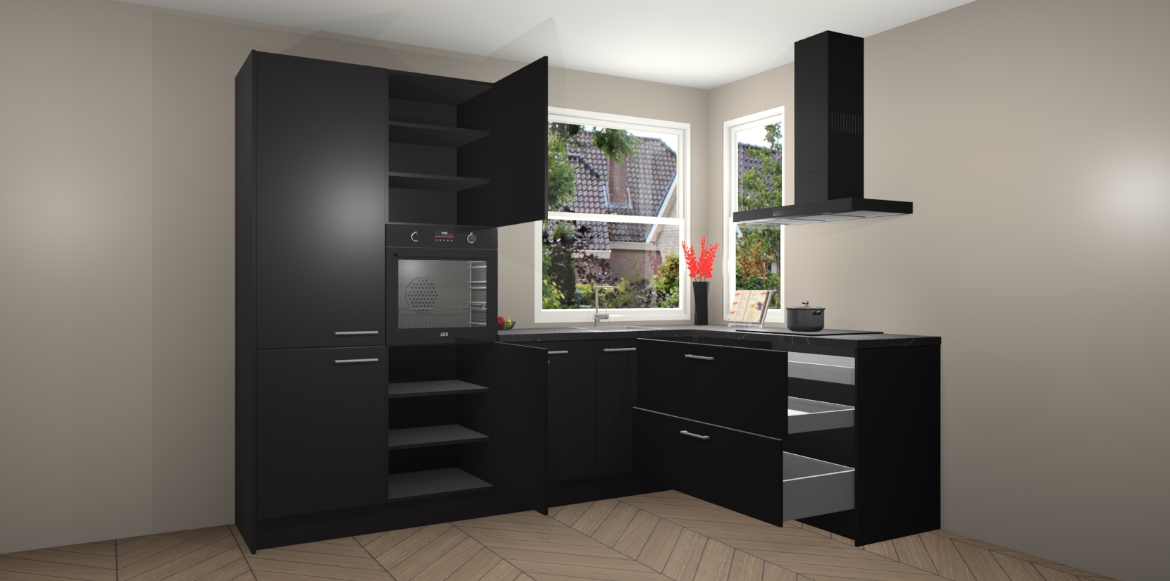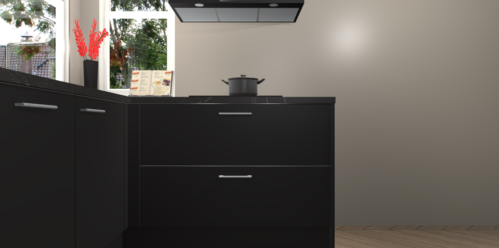 Het is tijd om halsoverkop verliefd te worden op uw droomkeuken, en de Zwarte keuken Kotor is precies wat u nodig heeft! Met een moderne, tijdloze constructie en een mix van prachtig design zal deze luxe hoekkeuken zeker opvallen. Maar laat de schoonheid u niet afleiden van de indrukwekkende functies - want onder dit alles schuilt een onovertroffen hoeveelheid lekkers!
