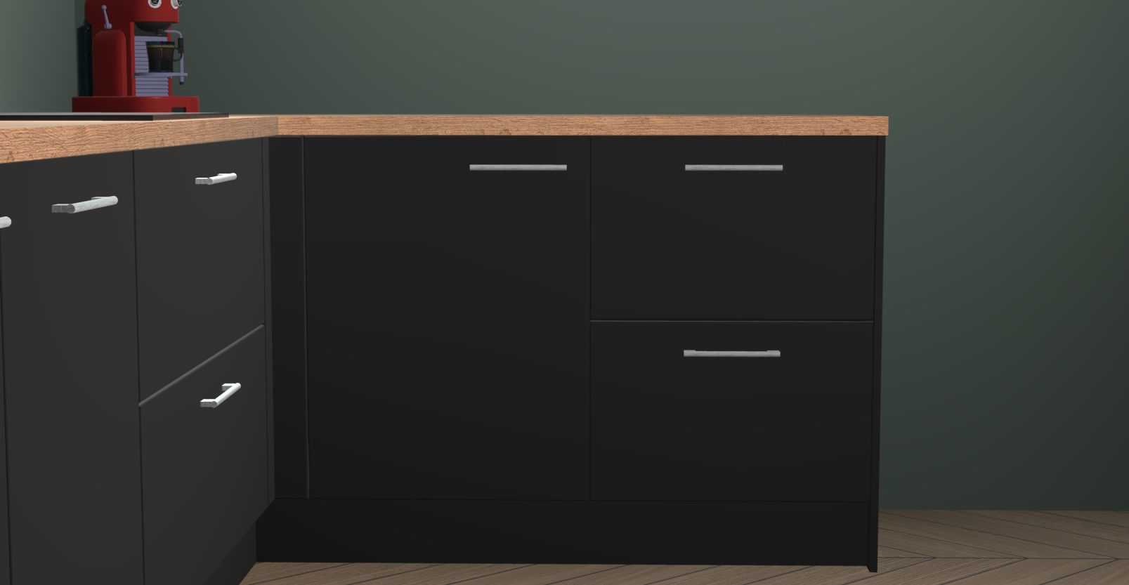 De Zwarte keuken Lille wordt geleverd met vijf inbouwapparaten - een oven, inductiekookplaat, afzuigkap, vaatwasser en koelkast. Maar dat is nog niet alles! Na bestelling kunnen deze apparaten eenvoudig worden geüpgraded naar premium AEG-apparatuur. Bovendien is er zelfs de optie om de oven te vervangen door een combimagnetron of uw inductiekookplaat te vervangen door een kookplaat met geïntegreerde afzuiging.
