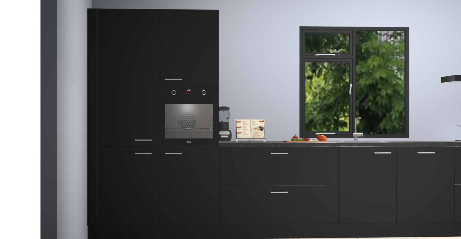 De Zwarte keuken Lille wordt geleverd met vijf inbouwapparaten - een oven, inductiekookplaat, afzuigkap, vaatwasser en koelkast. Maar dat is nog niet alles! Na bestelling kunnen deze apparaten eenvoudig worden geüpgraded naar premium AEG-apparatuur. Bovendien is er zelfs de optie om de oven te vervangen door een combimagnetron of uw inductiekookplaat te vervangen door een kookplaat met geïntegreerde afzuiging.