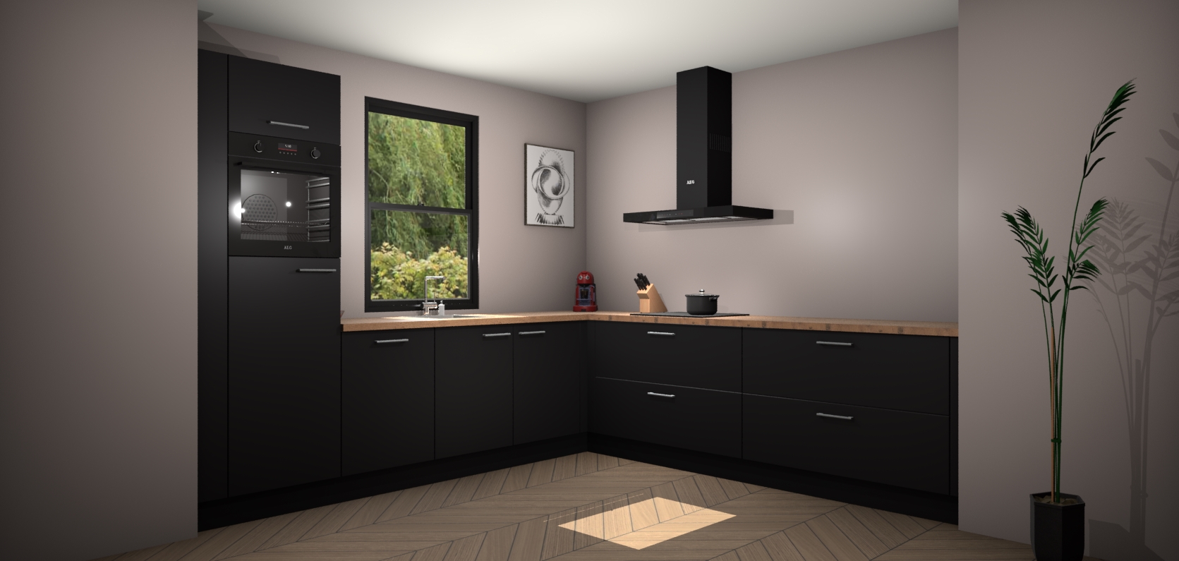 Welkom bij de zwarte keuken Lublin. Deze prachtige keuken zal de komende jaren het middelpunt van de belangstelling in uw huis zijn. Uitgerust met vijf inbouwapparaten komt u nooit kookgereedschap tekort. Bovendien geeft de warme houtlook elke ruimte een uitnodigende en tijdloze uitstraling.