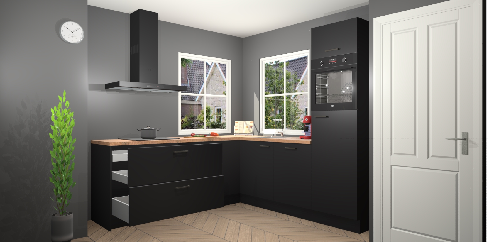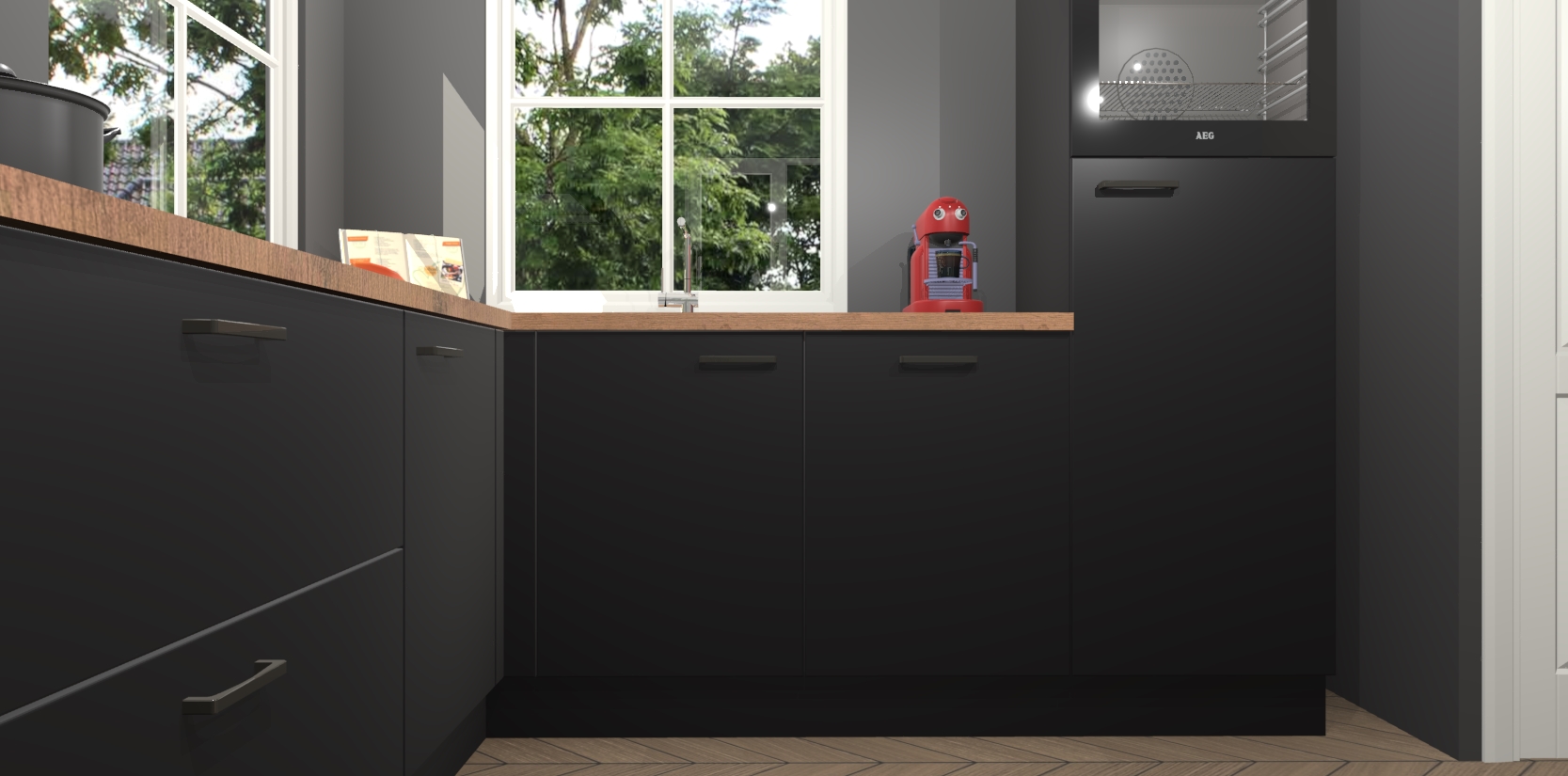De Zwarte keuken Pai bevat vijf essentiële inbouwapparaten - een oven, inductiekookplaat, afzuigkap, vaatwasser en koelkast - zodat u er na levering meteen in kunt. Voor de slimme kopers die weten dat apparaten vaak het verschil kunnen maken tussen functioneel en luxueus, bieden we eenvoudige upgradeopties naar AEG, van oven naar combimagnetron na bestelling of naar een kookplaat met geïntrigeerde afzuiging. En met onze vaste lage prijs en snelle levering binnen zeven weken vanaf de orderbevestiging hoeft u zich geen zorgen te maken over verborgen kosten of lange levertijden die uw droomkeuken kunnen vertragen.