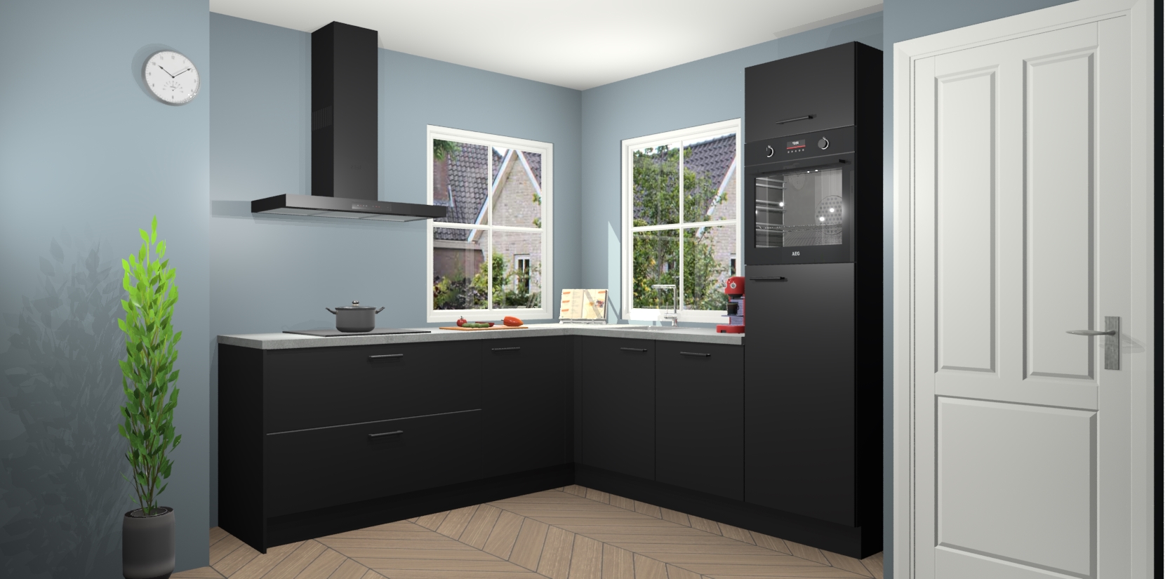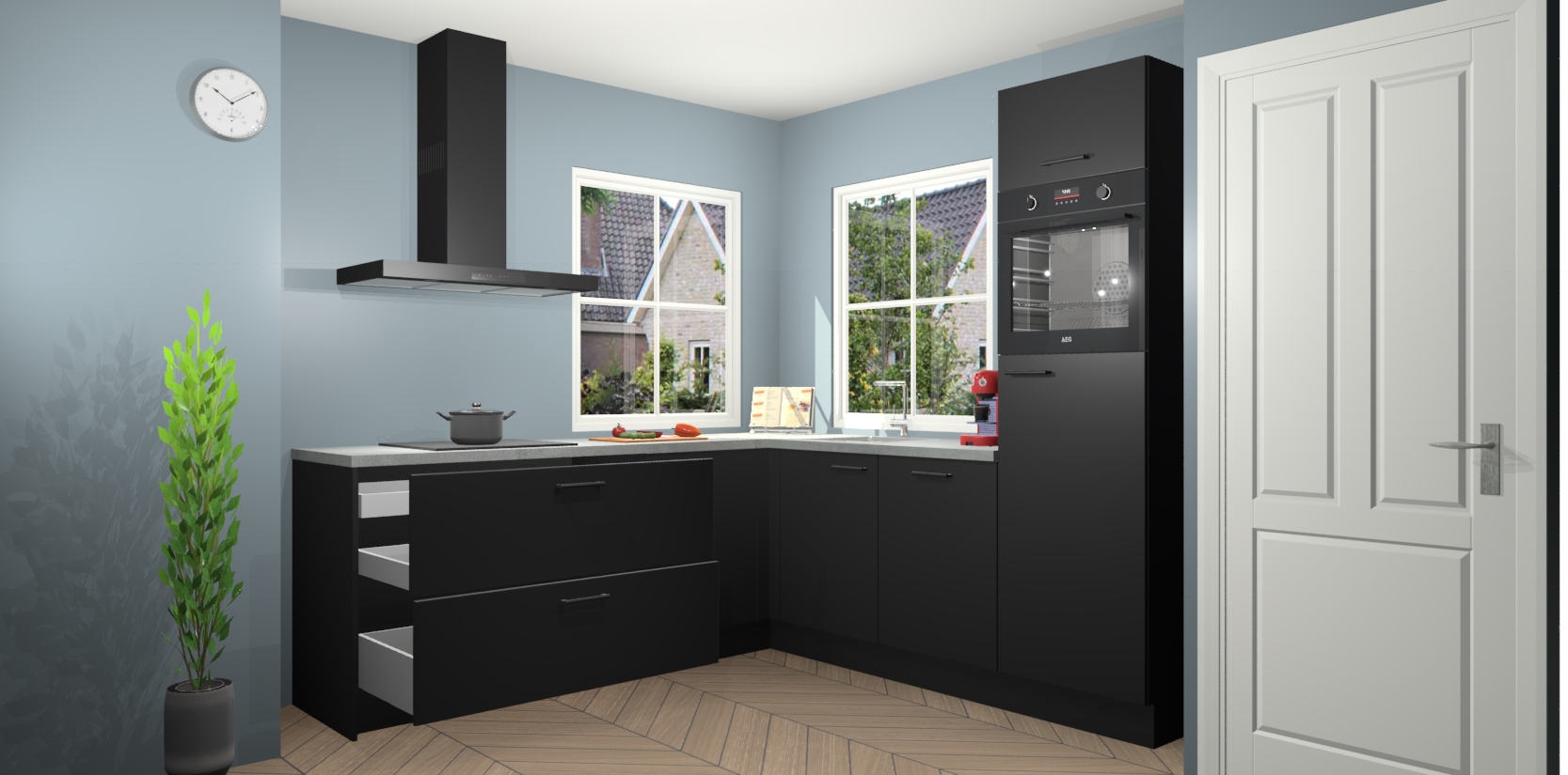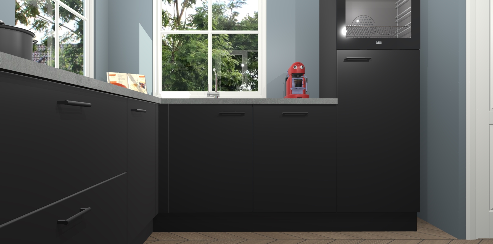 De Zwarte keuken Pai bevat vijf essentiële inbouwapparaten - een oven, inductiekookplaat, afzuigkap, vaatwasser en koelkast - zodat u er na levering meteen in kunt. Voor de slimme kopers die weten dat apparaten vaak het verschil kunnen maken tussen functioneel en luxueus, bieden we eenvoudige upgradeopties naar AEG, van oven naar combimagnetron na bestelling of naar een kookplaat met geïntrigeerde afzuiging. En met onze vaste lage prijs en snelle levering binnen zeven weken vanaf de orderbevestiging hoeft u zich geen zorgen te maken over verborgen kosten of lange levertijden die uw droomkeuken kunnen vertragen.