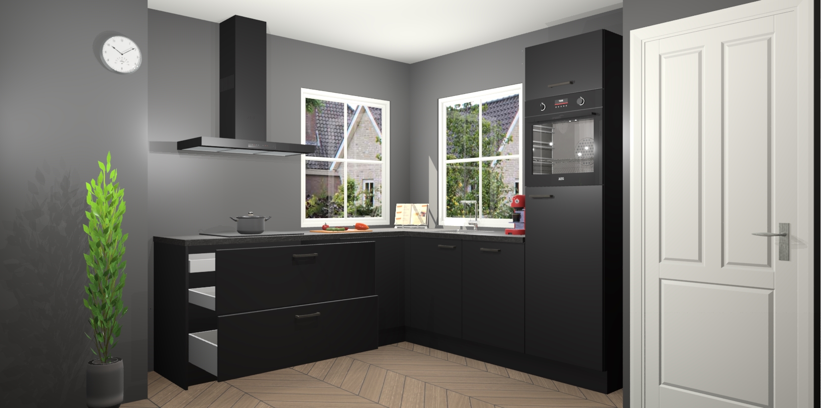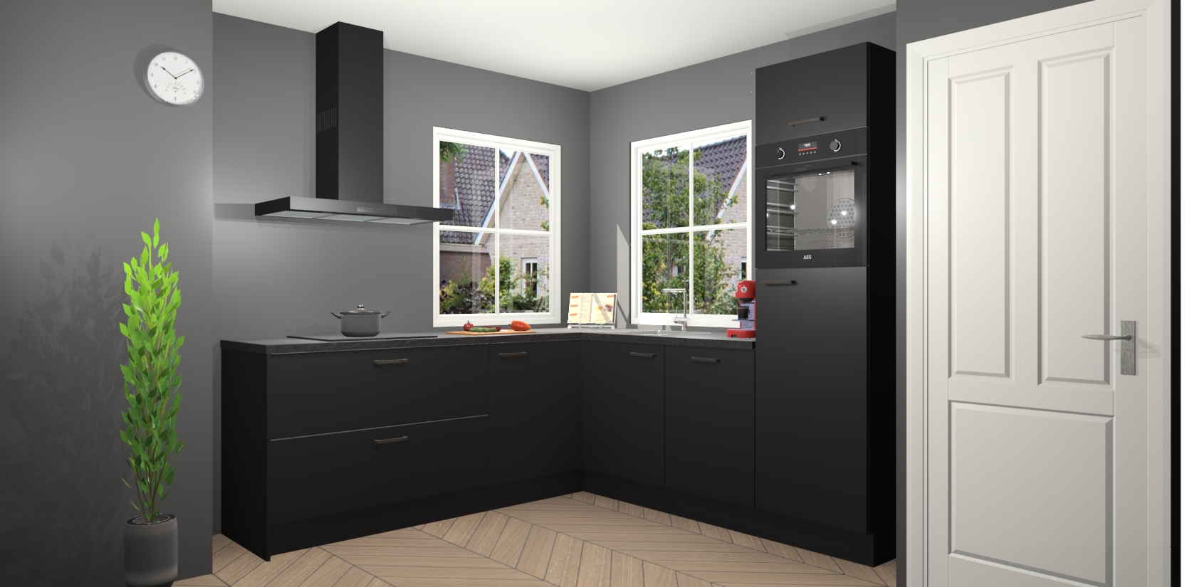 De Zwarte keuken Pai bevat vijf essentiële inbouwapparaten - een oven, inductiekookplaat, afzuigkap, vaatwasser en koelkast - zodat u er na levering meteen in kunt. Voor de slimme kopers die weten dat apparaten vaak het verschil kunnen maken tussen functioneel en luxueus, bieden we eenvoudige upgradeopties naar AEG, van oven naar combimagnetron na bestelling of naar een kookplaat met geïntrigeerde afzuiging. En met onze vaste lage prijs en snelle levering binnen zeven weken vanaf de orderbevestiging hoeft u zich geen zorgen te maken over verborgen kosten of lange levertijden die uw droomkeuken kunnen vertragen.