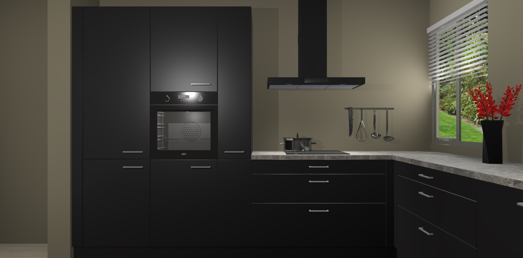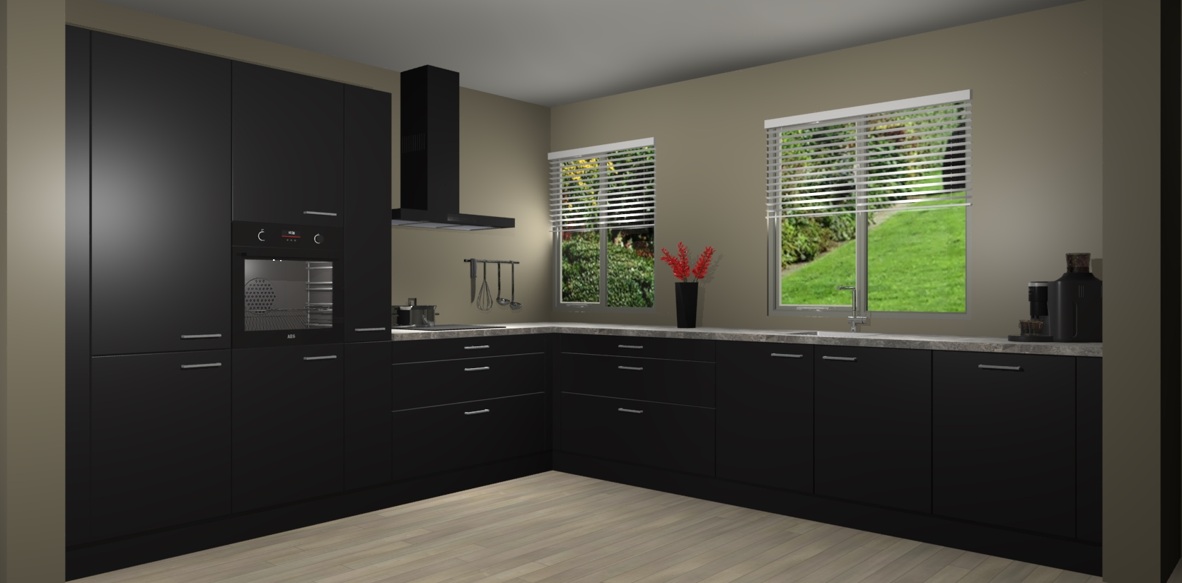 Welkom bij de Zwarte keuken Palermo. Deze prachtige keuken zal de komende jaren het middelpunt van de belangstelling in uw huis zijn. Uitgerust met vijf inbouwapparaten komt u nooit kookgereedschap tekort. Bovendien geeft de warme houtlook elke ruimte een uitnodigende en tijdloze uitstraling.
