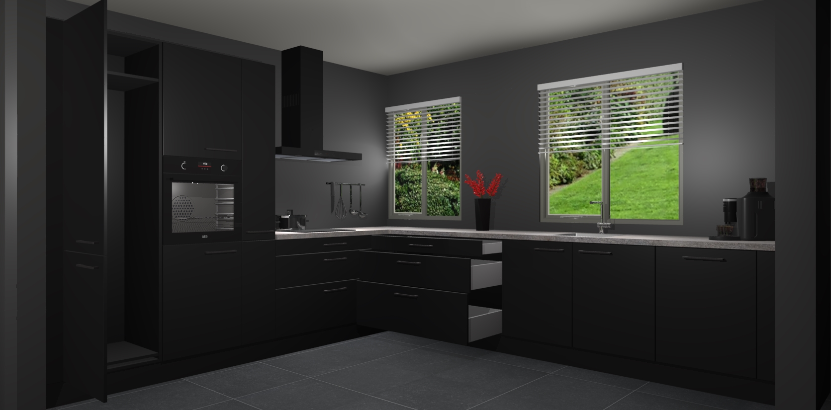 Welkom bij de Zwarte keuken Palermo. Deze prachtige keuken zal de komende jaren het middelpunt van de belangstelling in uw huis zijn. Uitgerust met vijf inbouwapparaten komt u nooit kookgereedschap tekort. Bovendien geeft de warme houtlook elke ruimte een uitnodigende en tijdloze uitstraling.