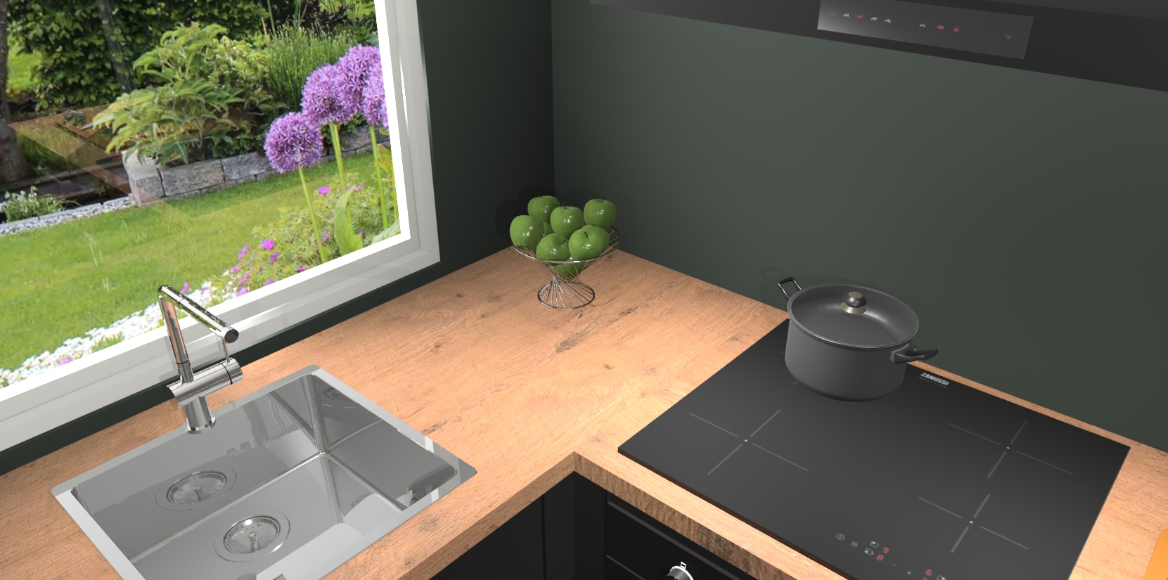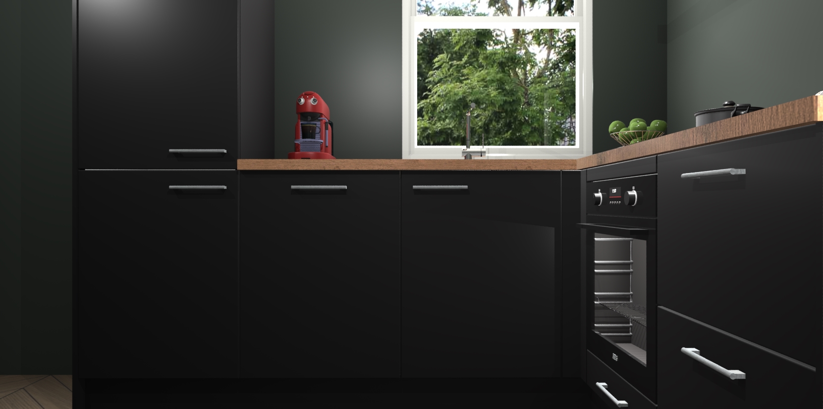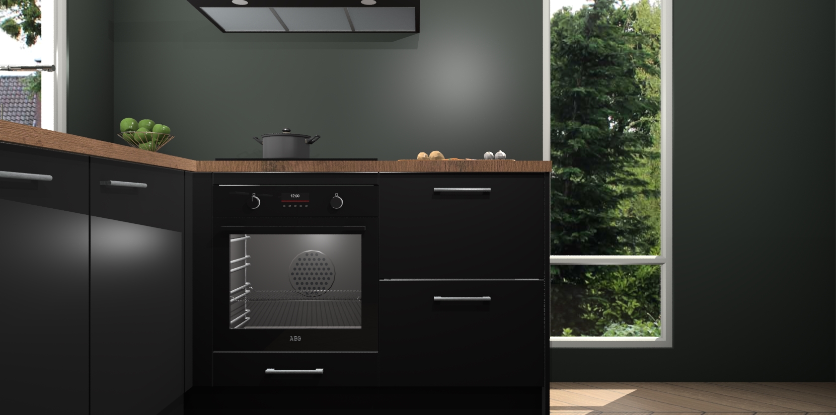 De Zwarte keuken Phuket heeft alles wat u maar kunt wensen. Niet alleen zijn er softclose deuren, maar ook 5 ingebouwde apparaten: een oven, inductiekookplaat, afzuigkap, vaatwasser en koelkast - waarbij u later gemakkelijk naar het AEG merk, van inductiekookplaat naar kookplaat met geïntegreerde afzuiging of van oven naar combimagnetron kunt upgraden. Dat alles tegen een vast laag tarief! Bovendien geeft de Zwarte keuken Phuket supersnelle levering van 7 weken. Echt iets voor u als u er niet op wilt wachten om het resultaat te zien in eigen keuken!