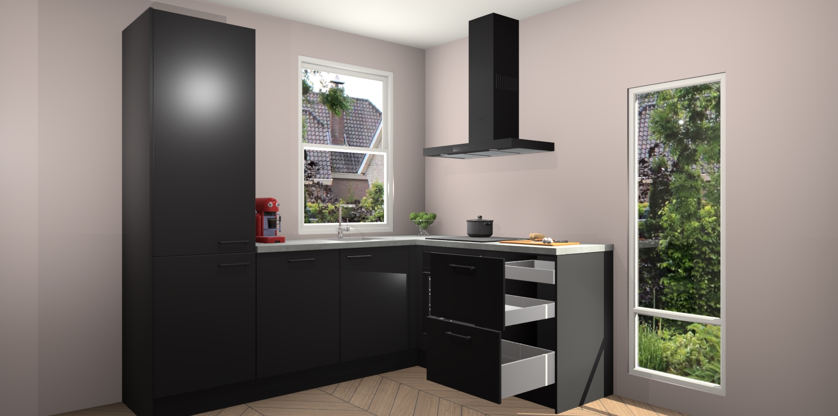 De prachtige Zwarte keuken Phuket is de perfecte keuze als u op zoek bent naar een moderne hoekkeuken met alle luxe en comfort die u kunt verwachten! De uitstraling in het houtlook-design draagt bij aan de warme sfeer die u nu al voelt wanneer u er naar kijkt. Heeft u genoeg van ouderwetse keukens? Probeer dan direct deze moderne, mooie hoekkeukens en laat iedereen verbluft achter!