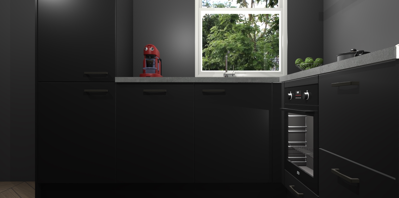 De Zwarte keuken Phuket heeft alles wat u maar kunt wensen. Niet alleen zijn er softclose deuren, maar ook 5 ingebouwde apparaten: een oven, inductiekookplaat, afzuigkap, vaatwasser en koelkast - waarbij u later gemakkelijk naar het AEG merk, van inductiekookplaat naar kookplaat met geïntegreerde afzuiging of van oven naar combimagnetron kunt upgraden. Dat alles tegen een vast laag tarief! Bovendien geeft de Zwarte keuken Phuket supersnelle levering van 7 weken. Echt iets voor u als u er niet op wilt wachten om het resultaat te zien in eigen keuken!