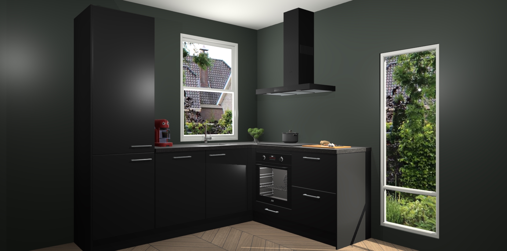 De Zwarte keuken Phuket heeft alles wat u maar kunt wensen. Niet alleen zijn er softclose deuren, maar ook 5 ingebouwde apparaten: een oven, inductiekookplaat, afzuigkap, vaatwasser en koelkast - waarbij u later gemakkelijk naar het AEG merk, van inductiekookplaat naar kookplaat met geïntegreerde afzuiging of van oven naar combimagnetron kunt upgraden. Dat alles tegen een vast laag tarief! Bovendien geeft de Zwarte keuken Phuket supersnelle levering van 7 weken. Echt iets voor u als u er niet op wilt wachten om het resultaat te zien in eigen keuken!