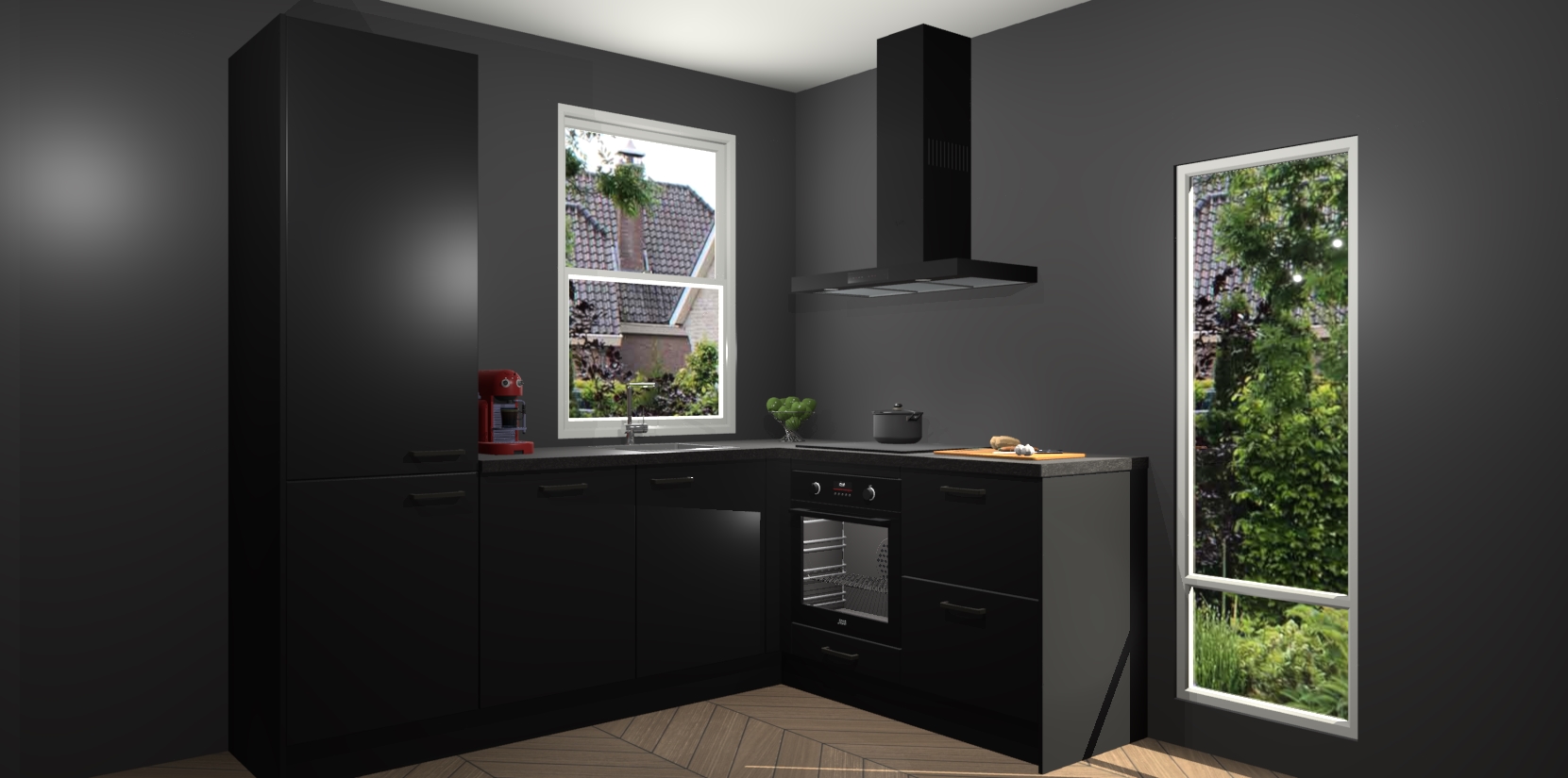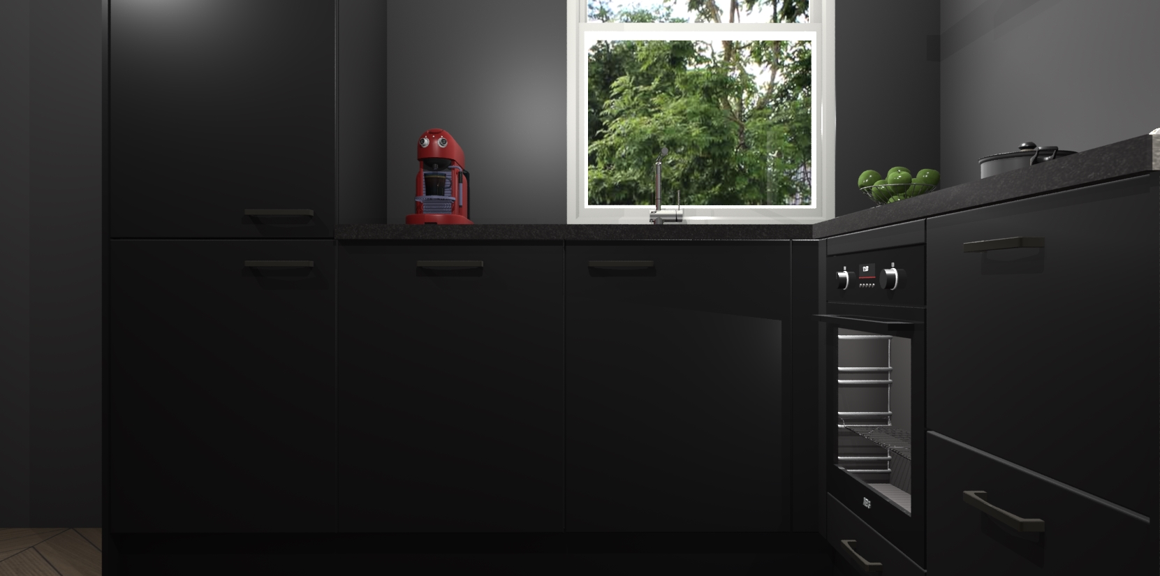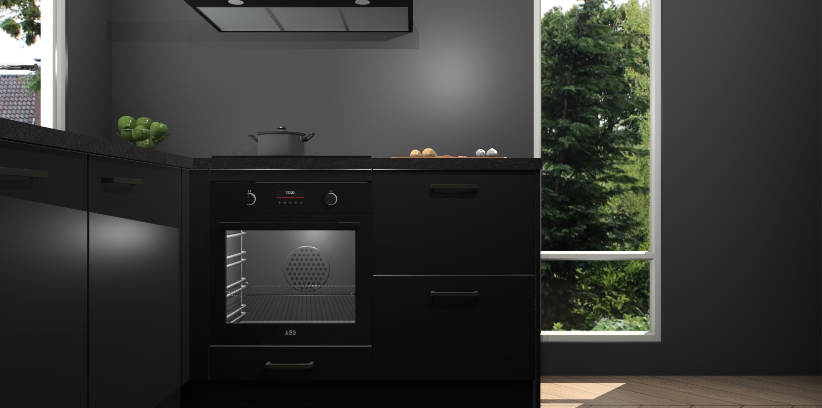 De Zwarte keuken Phuket heeft alles wat u maar kunt wensen. Niet alleen zijn er softclose deuren, maar ook 5 ingebouwde apparaten: een oven, inductiekookplaat, afzuigkap, vaatwasser en koelkast - waarbij u later gemakkelijk naar het AEG merk, van inductiekookplaat naar kookplaat met geïntegreerde afzuiging of van oven naar combimagnetron kunt upgraden. Dat alles tegen een vast laag tarief! Bovendien geeft de Zwarte keuken Phuket supersnelle levering van 7 weken. Echt iets voor u als u er niet op wilt wachten om het resultaat te zien in eigen keuken!