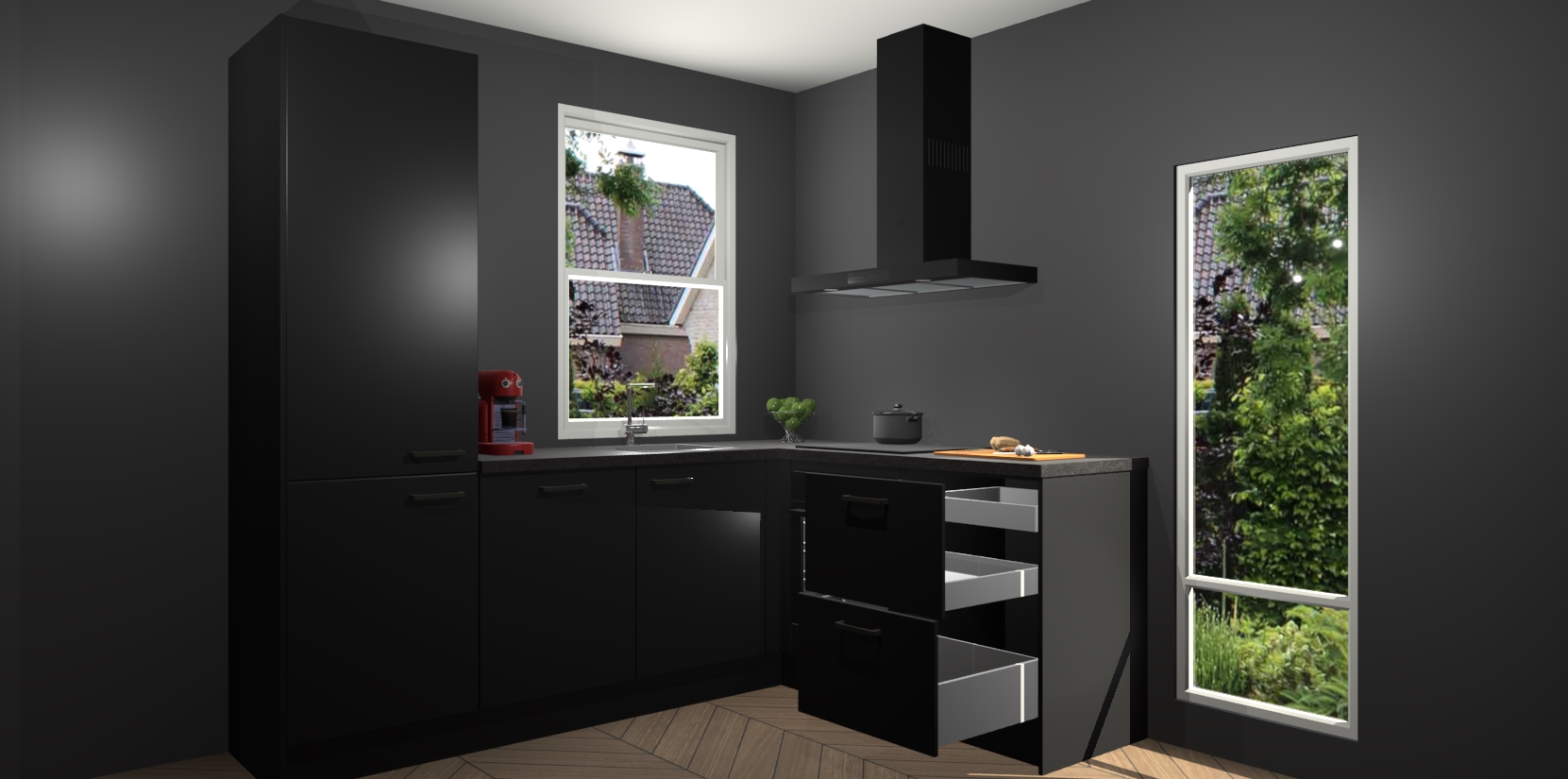 De prachtige Zwarte keuken Phuket is de perfecte keuze als u op zoek bent naar een moderne hoekkeuken met alle luxe en comfort die u kunt verwachten! De uitstraling in het houtlook-design draagt bij aan de warme sfeer die u nu al voelt wanneer u er naar kijkt. Heeft u genoeg van ouderwetse keukens? Probeer dan direct deze moderne, mooie hoekkeukens en laat iedereen verbluft achter!