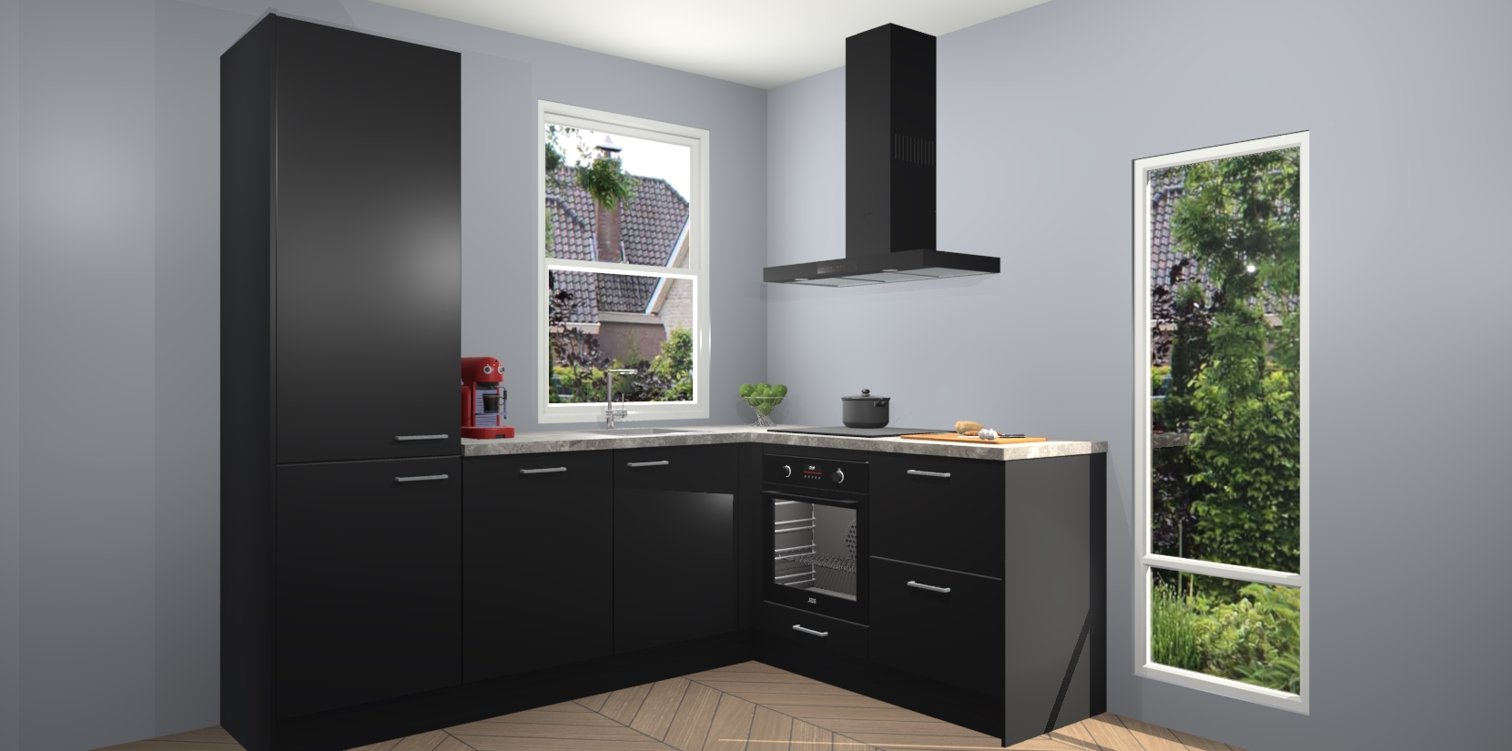 De prachtige Zwarte keuken Phuket is de perfecte keuze als u op zoek bent naar een moderne hoekkeuken met alle luxe en comfort die u kunt verwachten! De uitstraling in het houtlook-design draagt bij aan de warme sfeer die u nu al voelt wanneer u er naar kijkt. Heeft u genoeg van ouderwetse keukens? Probeer dan direct deze moderne, mooie hoekkeukens en laat iedereen verbluft achter!