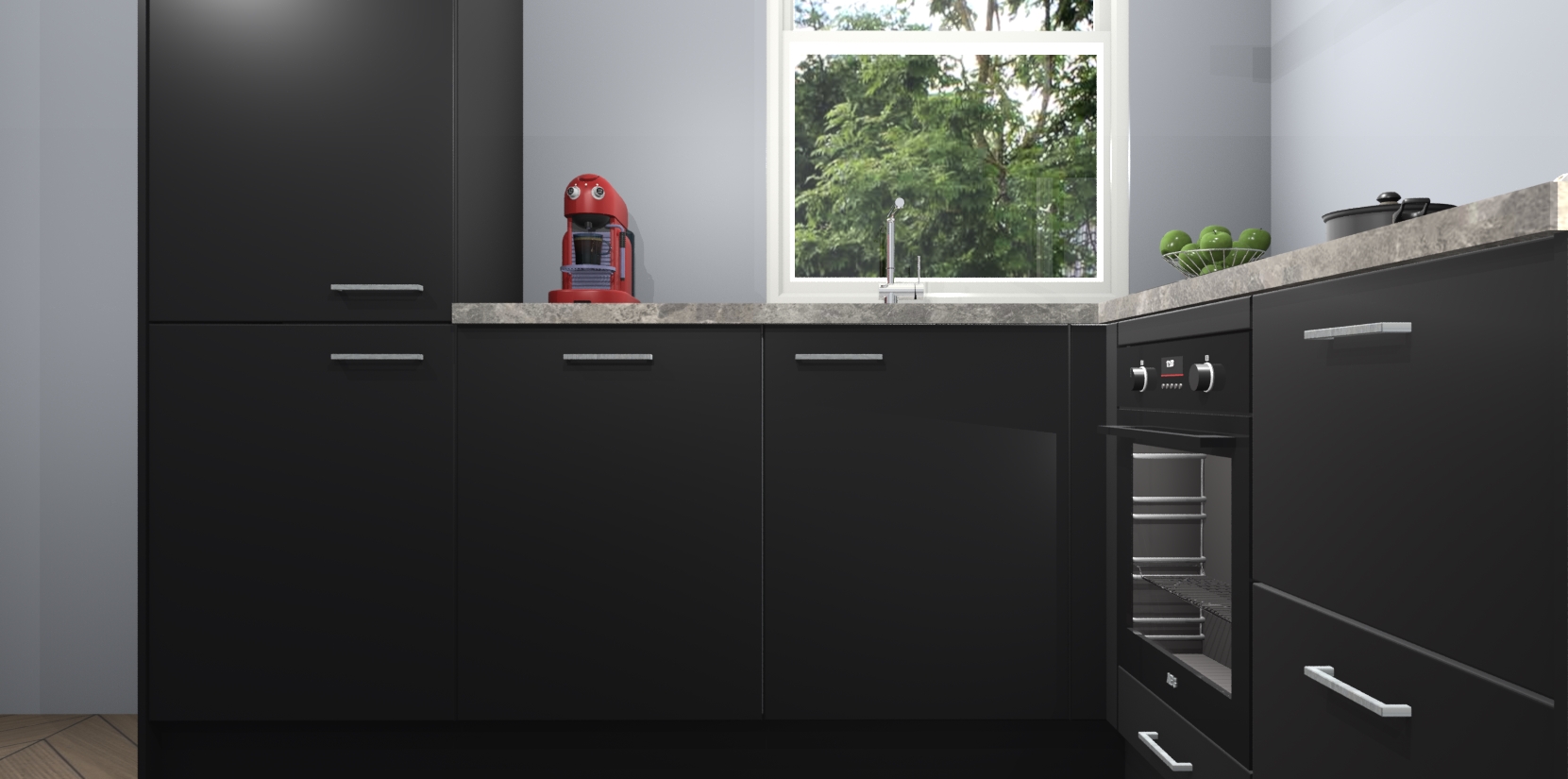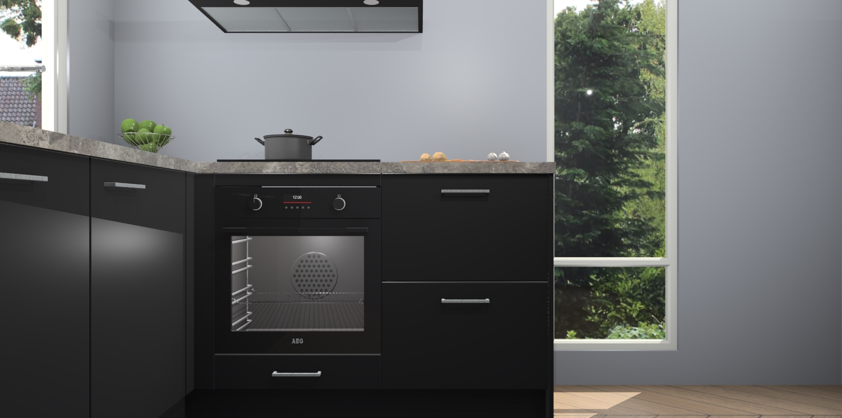 De Zwarte keuken Phuket heeft alles wat u maar kunt wensen. Niet alleen zijn er softclose deuren, maar ook 5 ingebouwde apparaten: een oven, inductiekookplaat, afzuigkap, vaatwasser en koelkast - waarbij u later gemakkelijk naar het AEG merk, van inductiekookplaat naar kookplaat met geïntegreerde afzuiging of van oven naar combimagnetron kunt upgraden. Dat alles tegen een vast laag tarief! Bovendien geeft de Zwarte keuken Phuket supersnelle levering van 7 weken. Echt iets voor u als u er niet op wilt wachten om het resultaat te zien in eigen keuken!