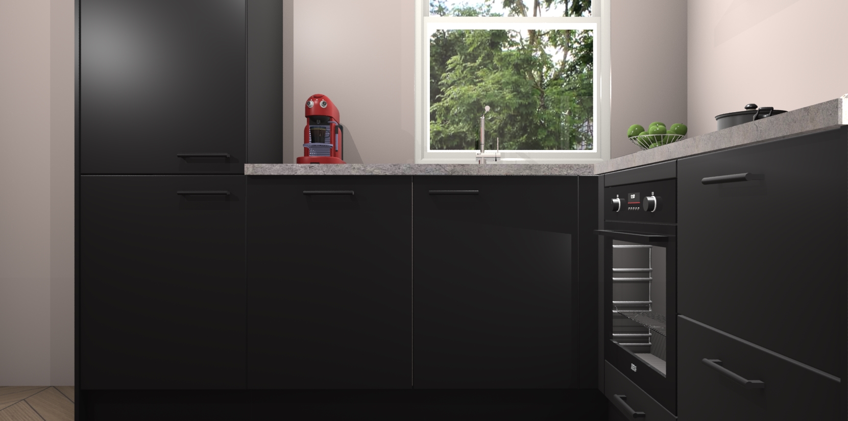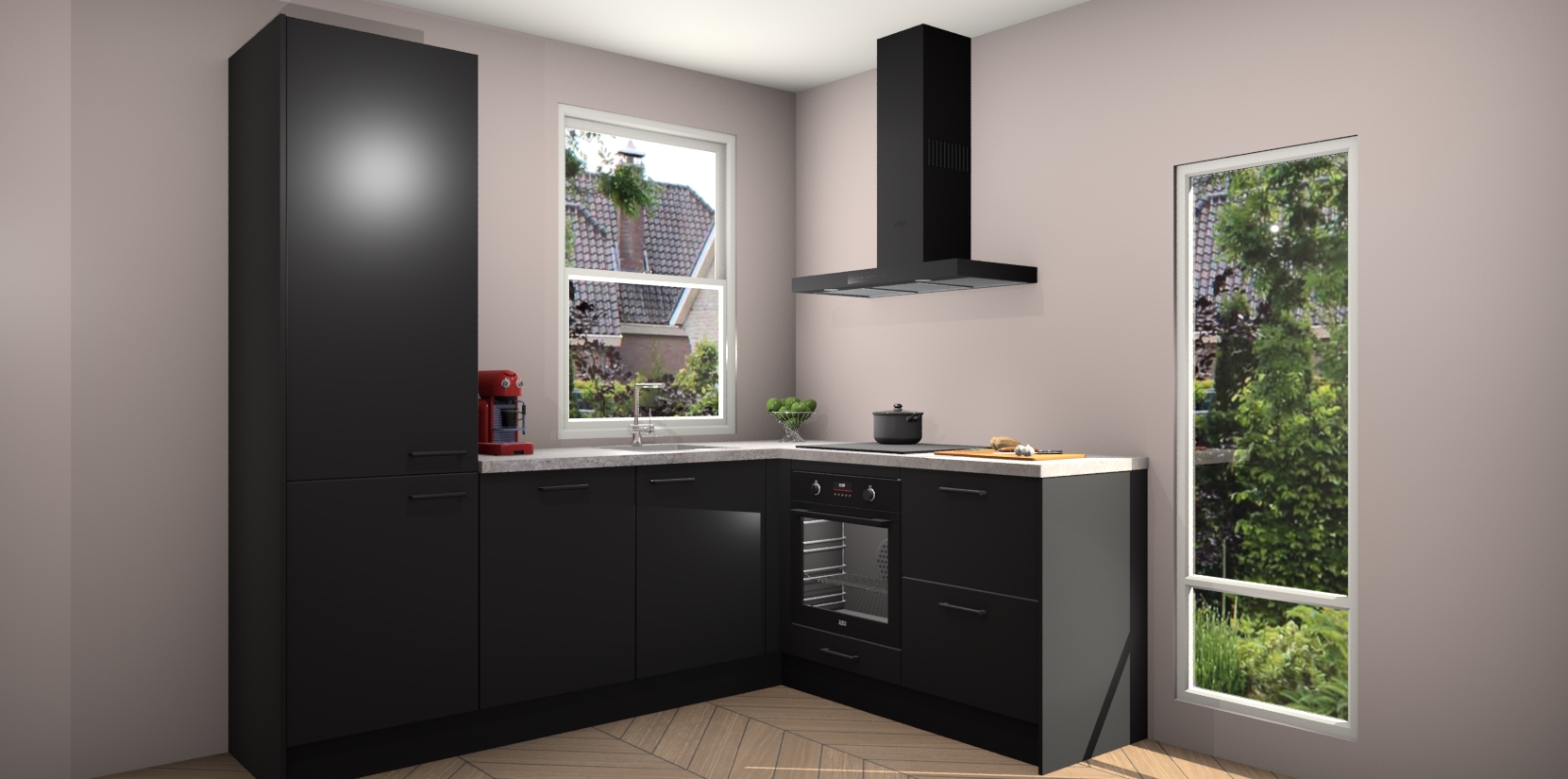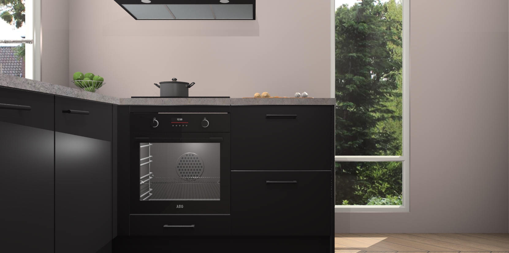 De Zwarte keuken Phuket heeft alles wat u maar kunt wensen. Niet alleen zijn er softclose deuren, maar ook 5 ingebouwde apparaten: een oven, inductiekookplaat, afzuigkap, vaatwasser en koelkast - waarbij u later gemakkelijk naar het AEG merk, van inductiekookplaat naar kookplaat met geïntegreerde afzuiging of van oven naar combimagnetron kunt upgraden. Dat alles tegen een vast laag tarief! Bovendien geeft de Zwarte keuken Phuket supersnelle levering van 7 weken. Echt iets voor u als u er niet op wilt wachten om het resultaat te zien in eigen keuken!