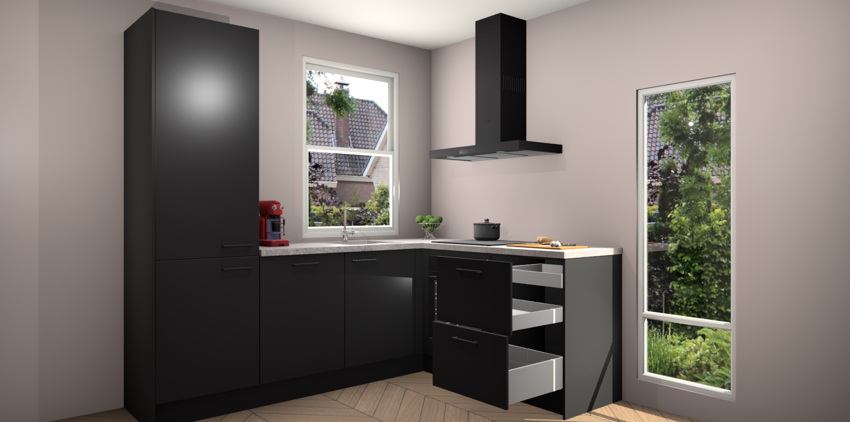 De prachtige Zwarte keuken Phuket is de perfecte keuze als u op zoek bent naar een moderne hoekkeuken met alle luxe en comfort die u kunt verwachten! De uitstraling in het houtlook-design draagt bij aan de warme sfeer die u nu al voelt wanneer u er naar kijkt. Heeft u genoeg van ouderwetse keukens? Probeer dan direct deze moderne, mooie hoekkeukens en laat iedereen verbluft achter!