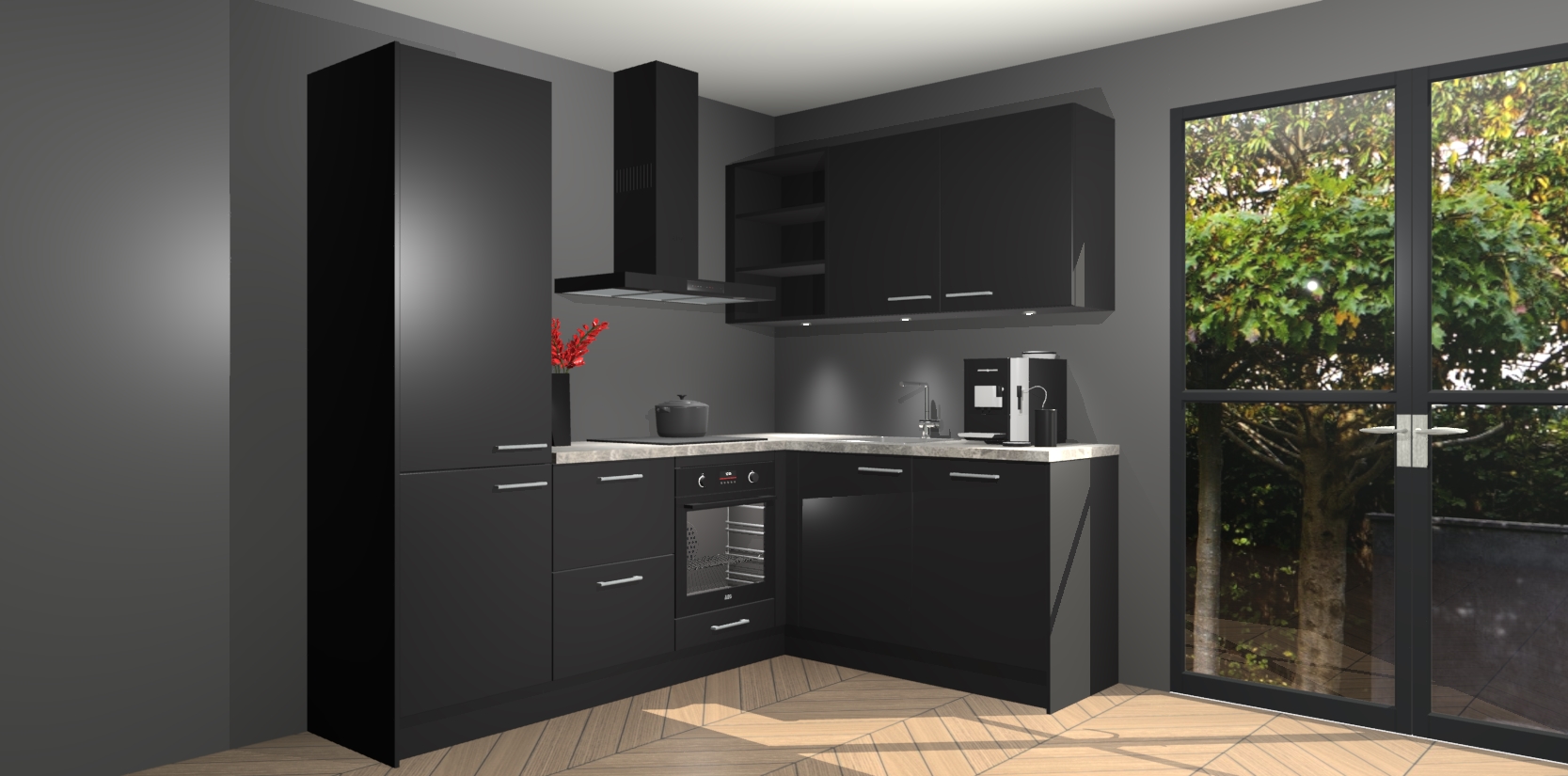 Wauw, dit is de Zwarte keuken Pilsen! U kunt gerust zeggen dat u elegantie combineert met functionaliteit met deze keuken. Met een modern en chique ontwerp is de keuken precies wat u nodig heeft om uw ruimte te verfraaien. De binnenzijde van de kasten is in dezelfde donkere kleur als de buitenzijde voor een uniforme look, compleet met softclose-kasten die stil sluiten.