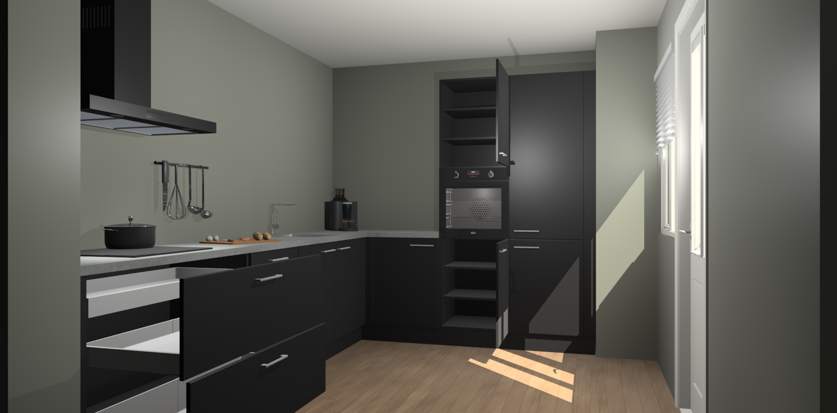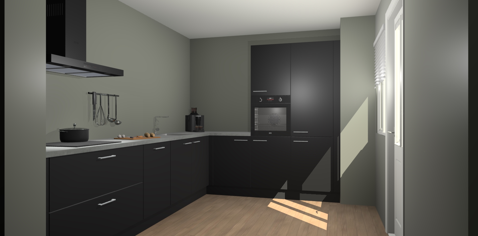 Welkom bij de Zwarte keuken Portland. Deze prachtige keuken zal de komende jaren het middelpunt van de belangstelling in uw huis zijn. Uitgerust met vijf inbouwapparaten komt u nooit kookgereedschap tekort. Bovendien geeft de warme houtlook elke ruimte een uitnodigende en tijdloze uitstraling.