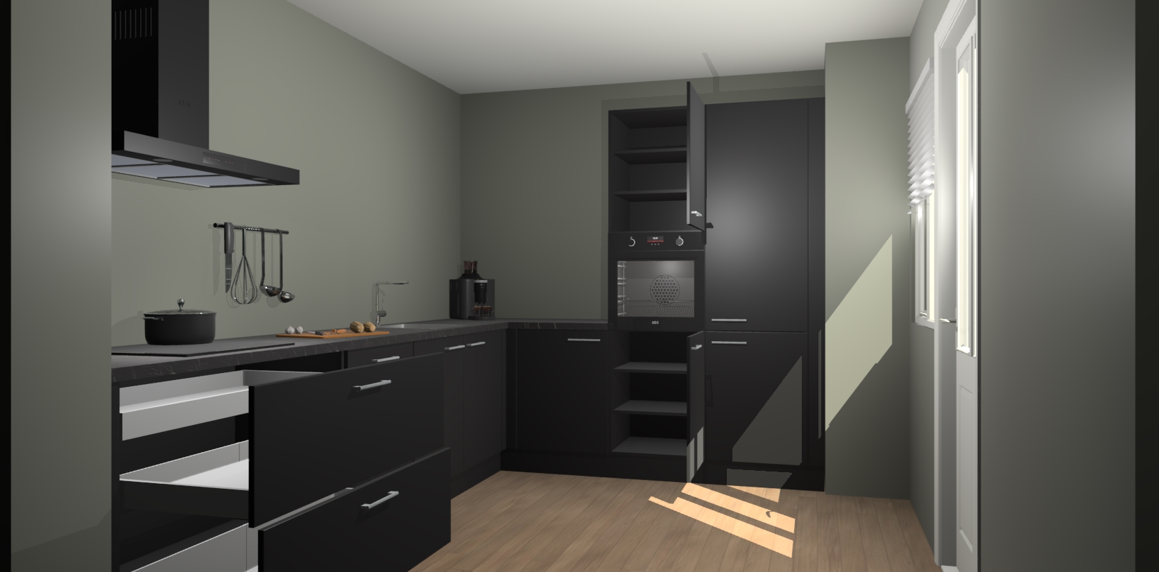 Welkom bij de Zwarte keuken Portland. Deze prachtige keuken zal de komende jaren het middelpunt van de belangstelling in uw huis zijn. Uitgerust met vijf inbouwapparaten komt u nooit kookgereedschap tekort. Bovendien geeft de warme houtlook elke ruimte een uitnodigende en tijdloze uitstraling.