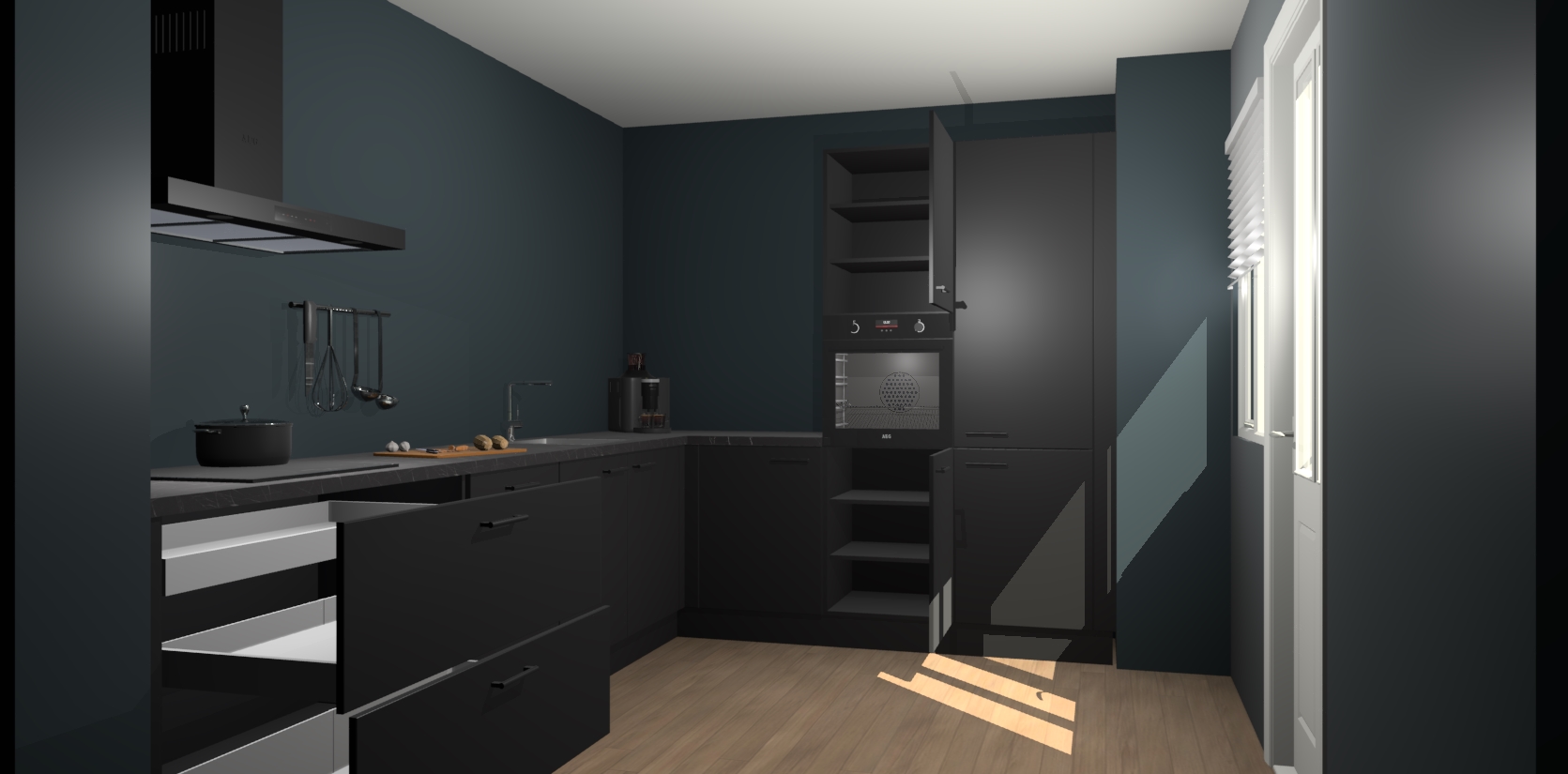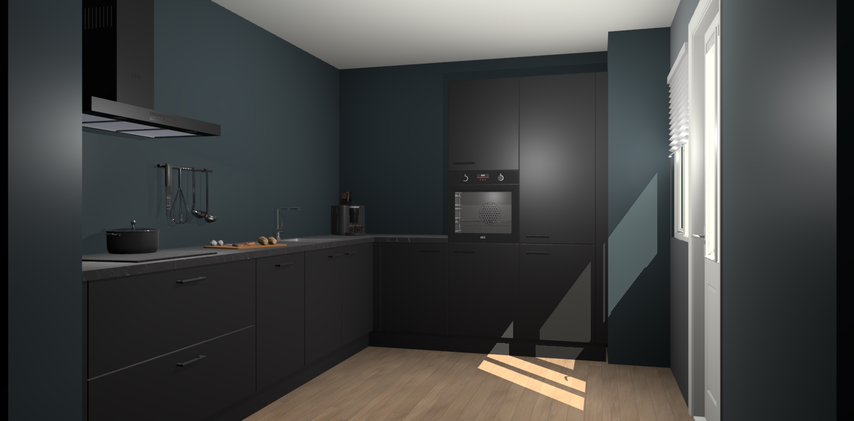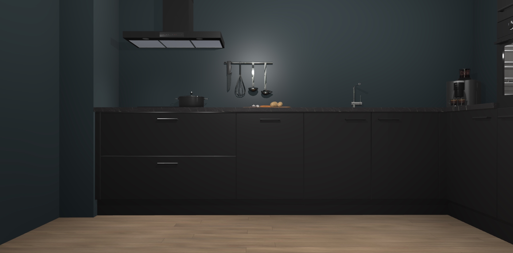 Welkom bij de Zwarte keuken Portland. Deze prachtige keuken zal de komende jaren het middelpunt van de belangstelling in uw huis zijn. Uitgerust met vijf inbouwapparaten komt u nooit kookgereedschap tekort. Bovendien geeft de warme houtlook elke ruimte een uitnodigende en tijdloze uitstraling.