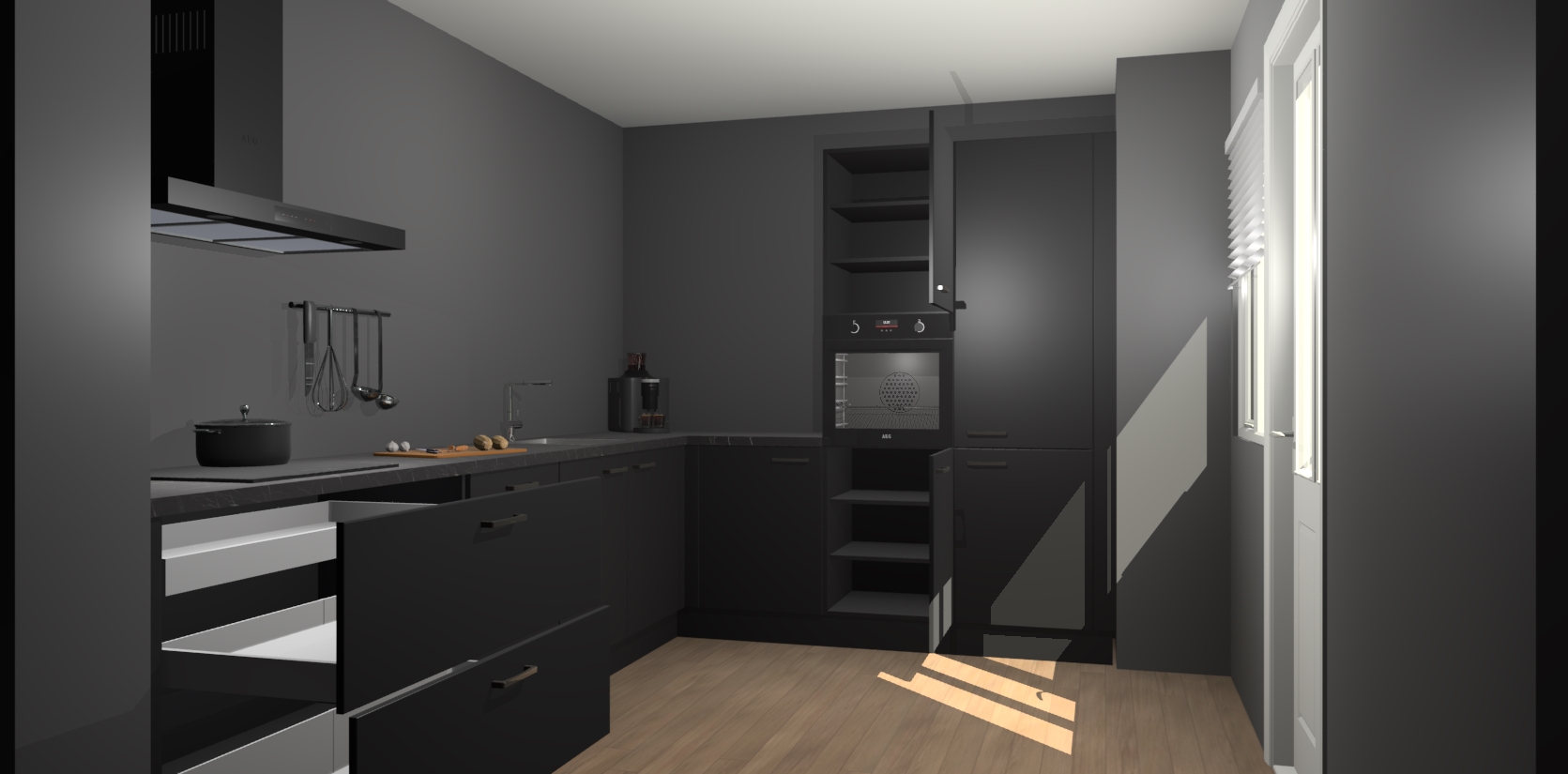 Welkom bij de Zwarte keuken Portland. Deze prachtige keuken zal de komende jaren het middelpunt van de belangstelling in uw huis zijn. Uitgerust met vijf inbouwapparaten komt u nooit kookgereedschap tekort. Bovendien geeft de warme houtlook elke ruimte een uitnodigende en tijdloze uitstraling.