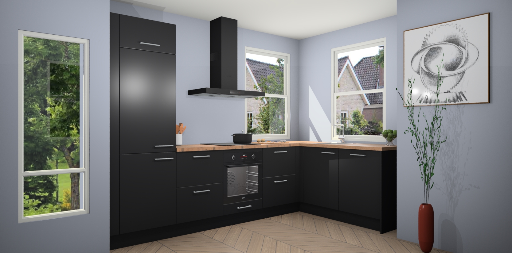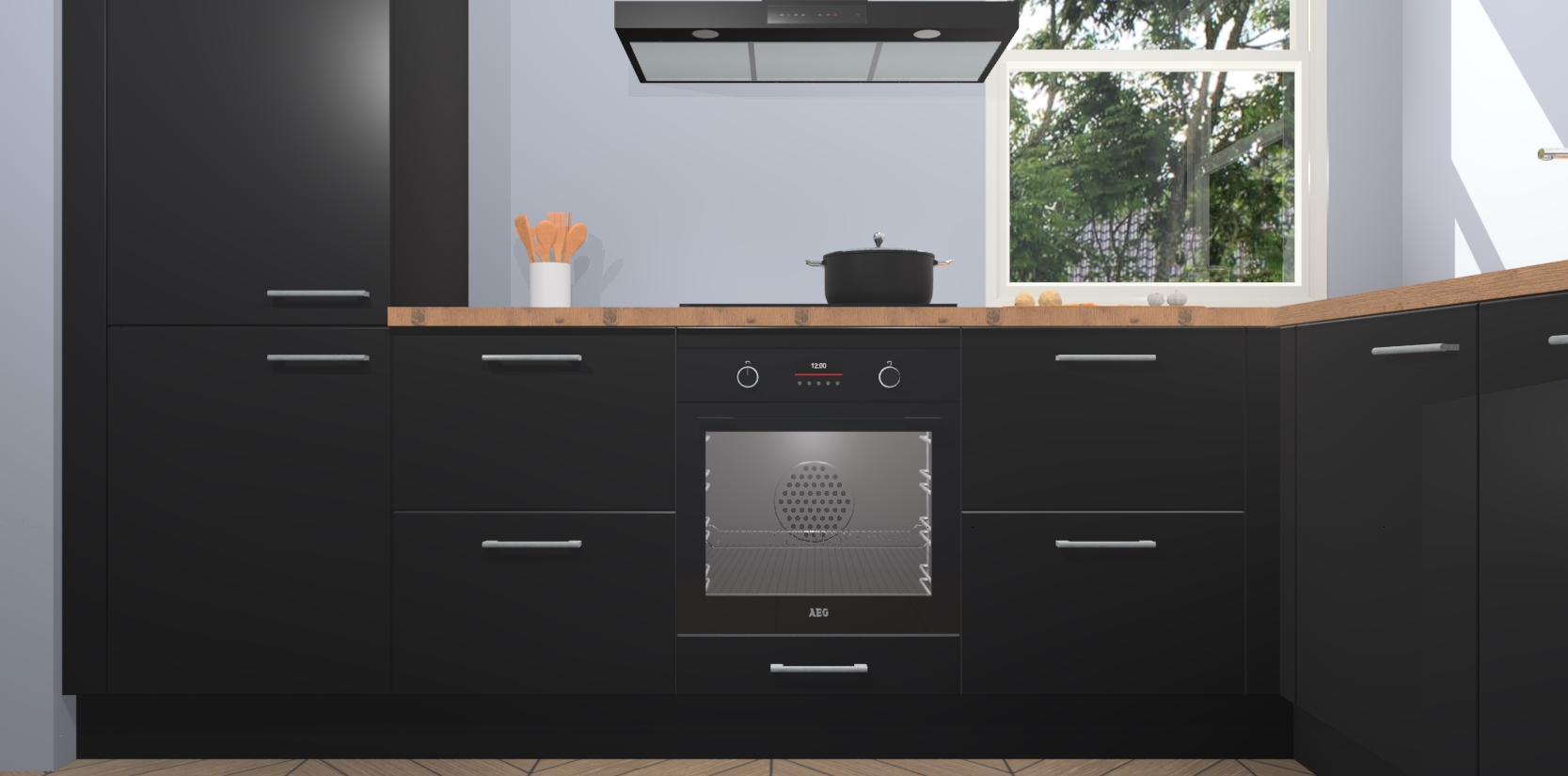 Wat maakt deze keuken zo bijzonder? Ten eerste geeft het houten werkblad uw ruimte een onmiskenbaar klassieke uitstraling. De natuurlijke afwerking roept warmte en elegantie op die nooit uit de mode zullen raken. Bovendien is het gemakkelijk schoon te houden en te onderhouden, zodat je er jarenlang plezier van kunt hebben. Als u op zoek bent naar extra gemak in uw keuken, dan heeft u bij het plaatsen van een bestelling bij ons ook de optie om uw toestellen te upgraden naar AEG-modellen - zo haalt u moderne innovatie van topmerken in apparatentechnologie rechtstreeks in huis.