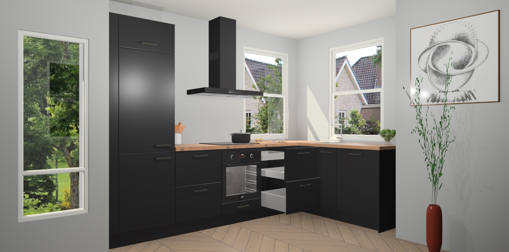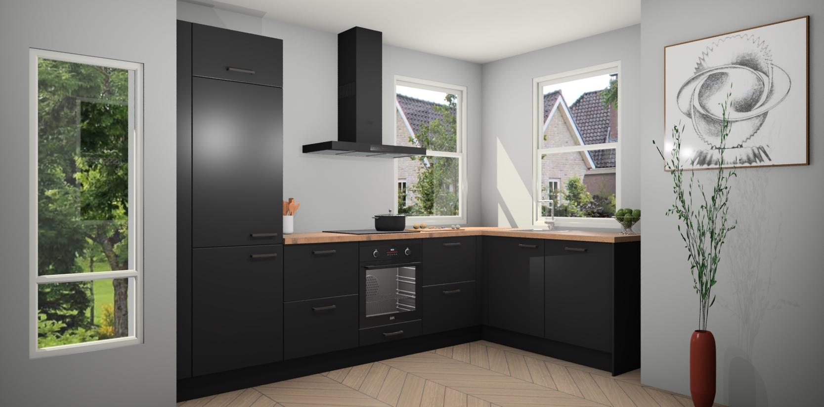 Wat maakt deze keuken zo bijzonder? Ten eerste geeft het houten werkblad uw ruimte een onmiskenbaar klassieke uitstraling. De natuurlijke afwerking roept warmte en elegantie op die nooit uit de mode zullen raken. Bovendien is het gemakkelijk schoon te houden en te onderhouden, zodat je er jarenlang plezier van kunt hebben. Als u op zoek bent naar extra gemak in uw keuken, dan heeft u bij het plaatsen van een bestelling bij ons ook de optie om uw toestellen te upgraden naar AEG-modellen - zo haalt u moderne innovatie van topmerken in apparatentechnologie rechtstreeks in huis.