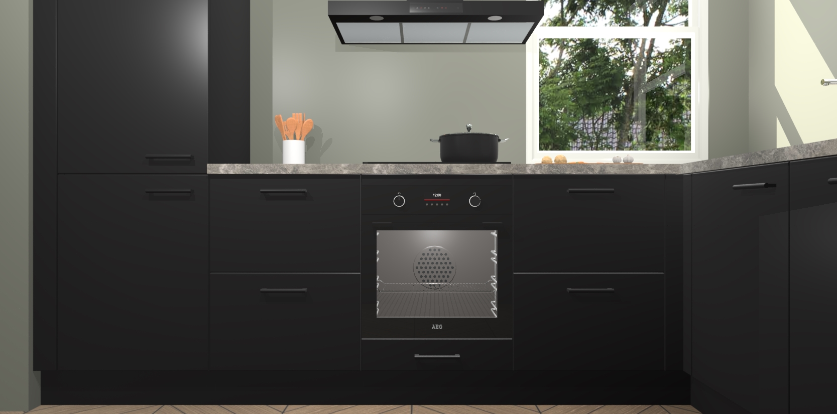 Wat maakt deze keuken zo bijzonder? Ten eerste geeft het houten werkblad uw ruimte een onmiskenbaar klassieke uitstraling. De natuurlijke afwerking roept warmte en elegantie op die nooit uit de mode zullen raken. Bovendien is het gemakkelijk schoon te houden en te onderhouden, zodat je er jarenlang plezier van kunt hebben. Als u op zoek bent naar extra gemak in uw keuken, dan heeft u bij het plaatsen van een bestelling bij ons ook de optie om uw toestellen te upgraden naar AEG-modellen - zo haalt u moderne innovatie van topmerken in apparatentechnologie rechtstreeks in huis.