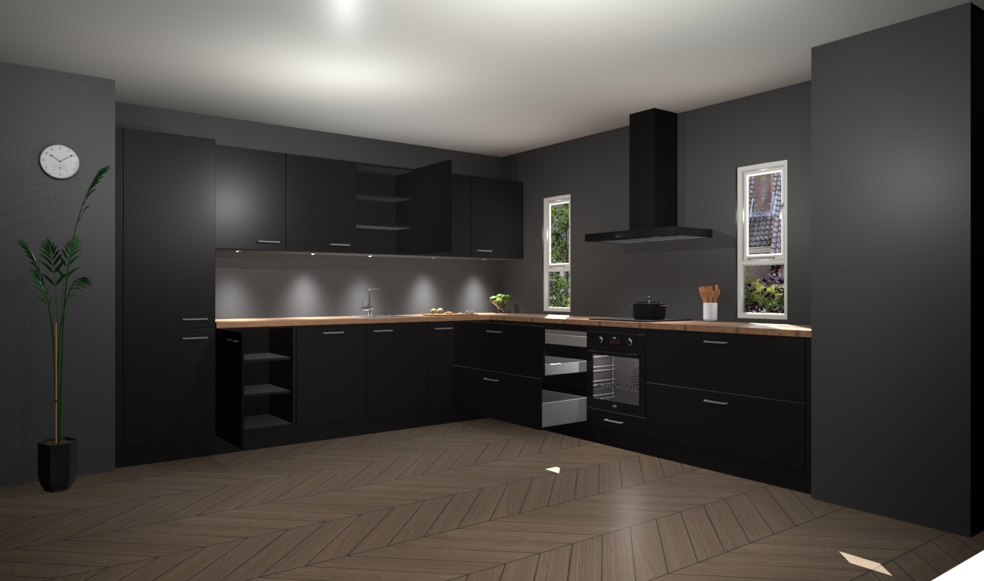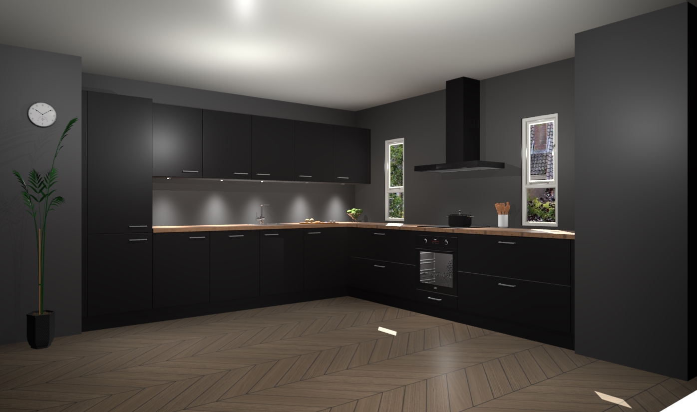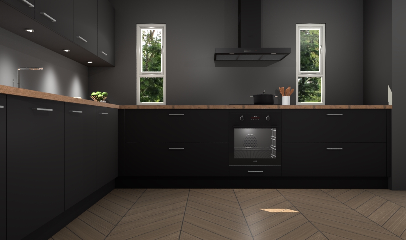 De zwarte keuken is een ideale hoekkeuken en heeft alle functies en apparatuur die u maar nodig kunt hebben. Bij de bestelling krijgt u een oven, inductiekookplaat, afzuigkap, vaatwasser en koelkast - deze kunnen desgewenst eenvoudig worden uitgebreid naar AEG na bestellen. Elke kast wordt ook voor gemonteerd geleverd met soft close deuren die jarenlang gebruik beloven. Stelt u zich voor dat u geen gedoe heeft met vervelende montage - vanaf het moment dat u uw bestelling plaats, duurt het slechts 7 weken voor het bij u thuis geleverd wordt.