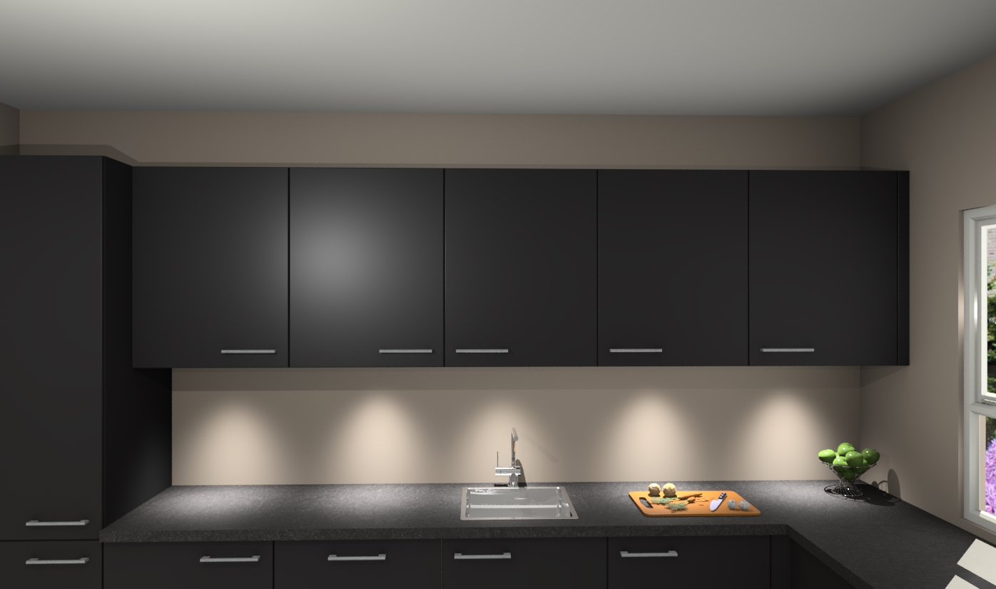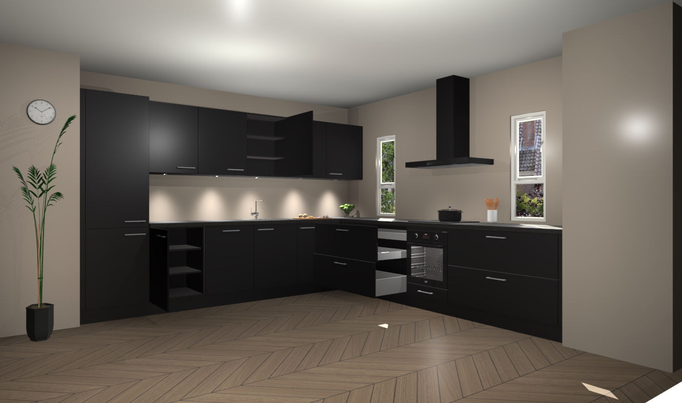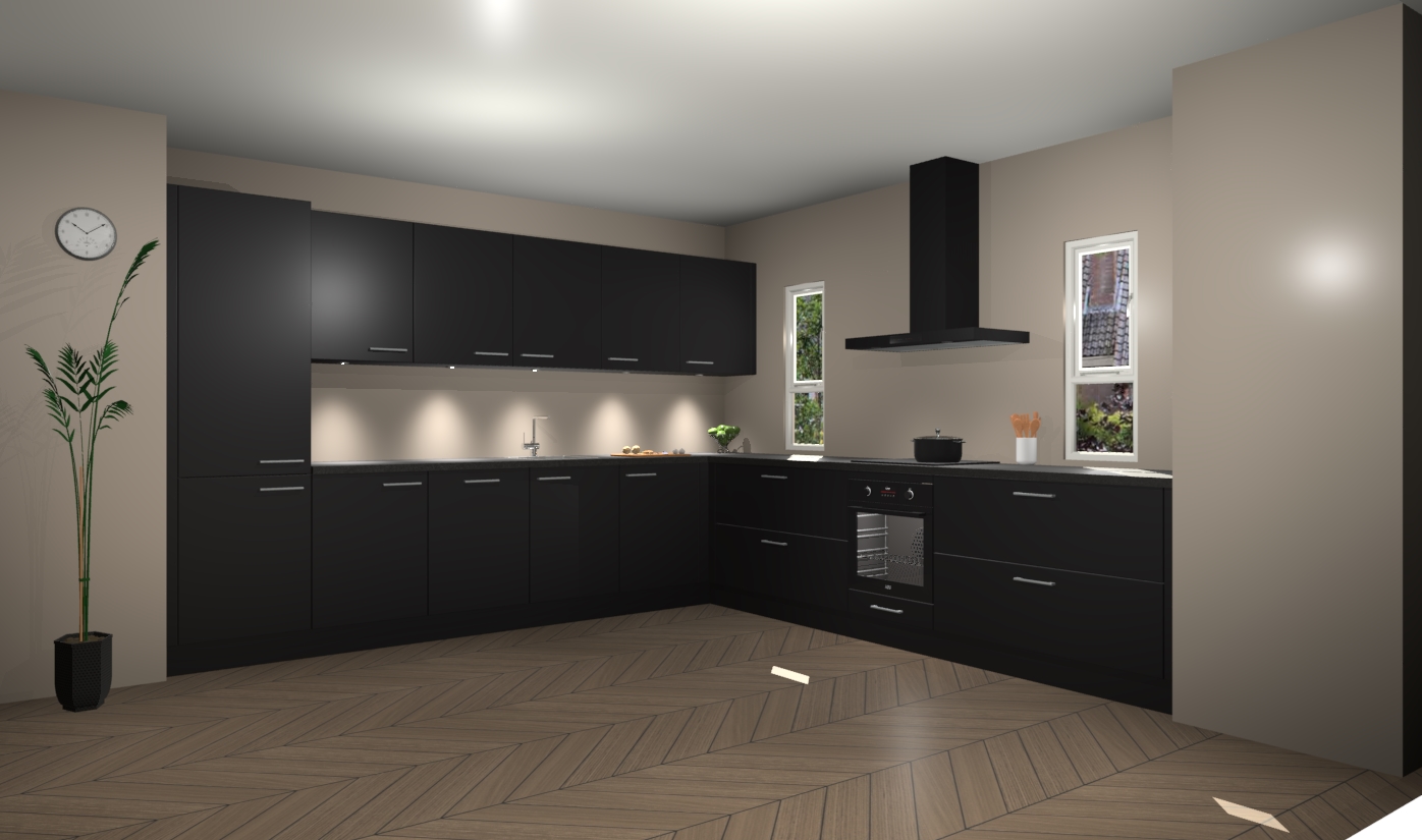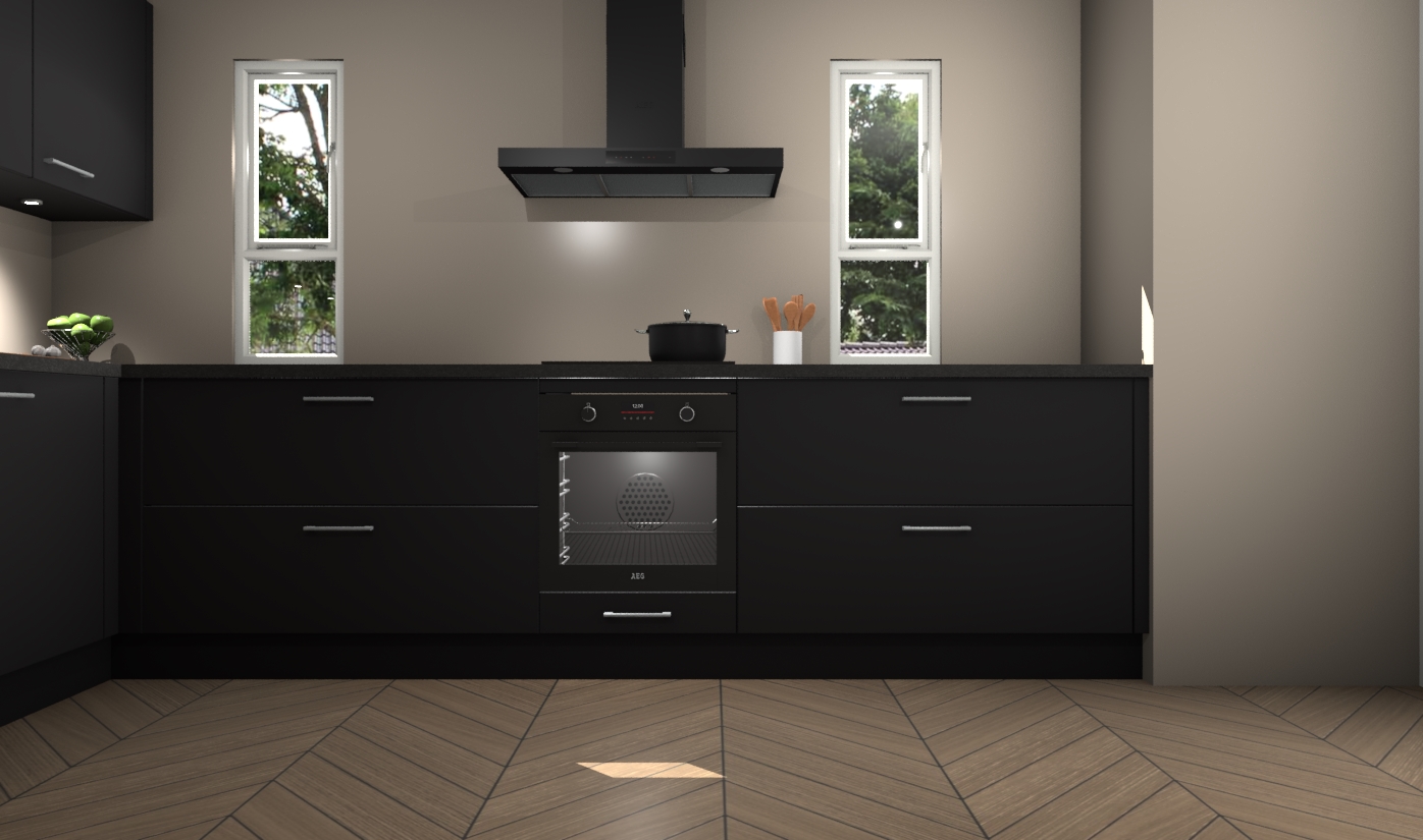 De zwarte keuken is een ideale hoekkeuken en heeft alle functies en apparatuur die u maar nodig kunt hebben. Bij de bestelling krijgt u een oven, inductiekookplaat, afzuigkap, vaatwasser en koelkast - deze kunnen desgewenst eenvoudig worden uitgebreid naar AEG na bestellen. Elke kast wordt ook voor gemonteerd geleverd met soft close deuren die jarenlang gebruik beloven. Stelt u zich voor dat u geen gedoe heeft met vervelende montage - vanaf het moment dat u uw bestelling plaats, duurt het slechts 7 weken voor het bij u thuis geleverd wordt.
