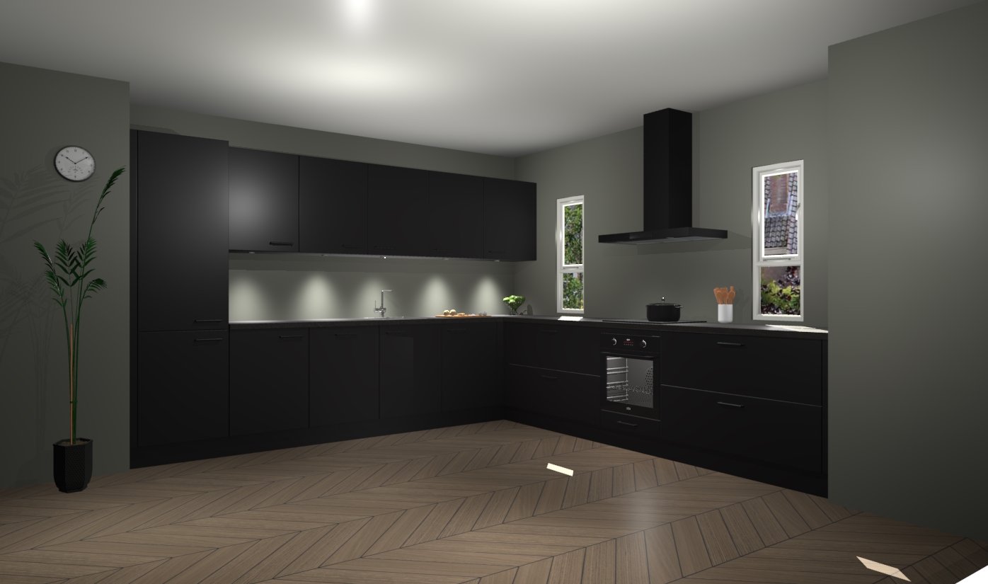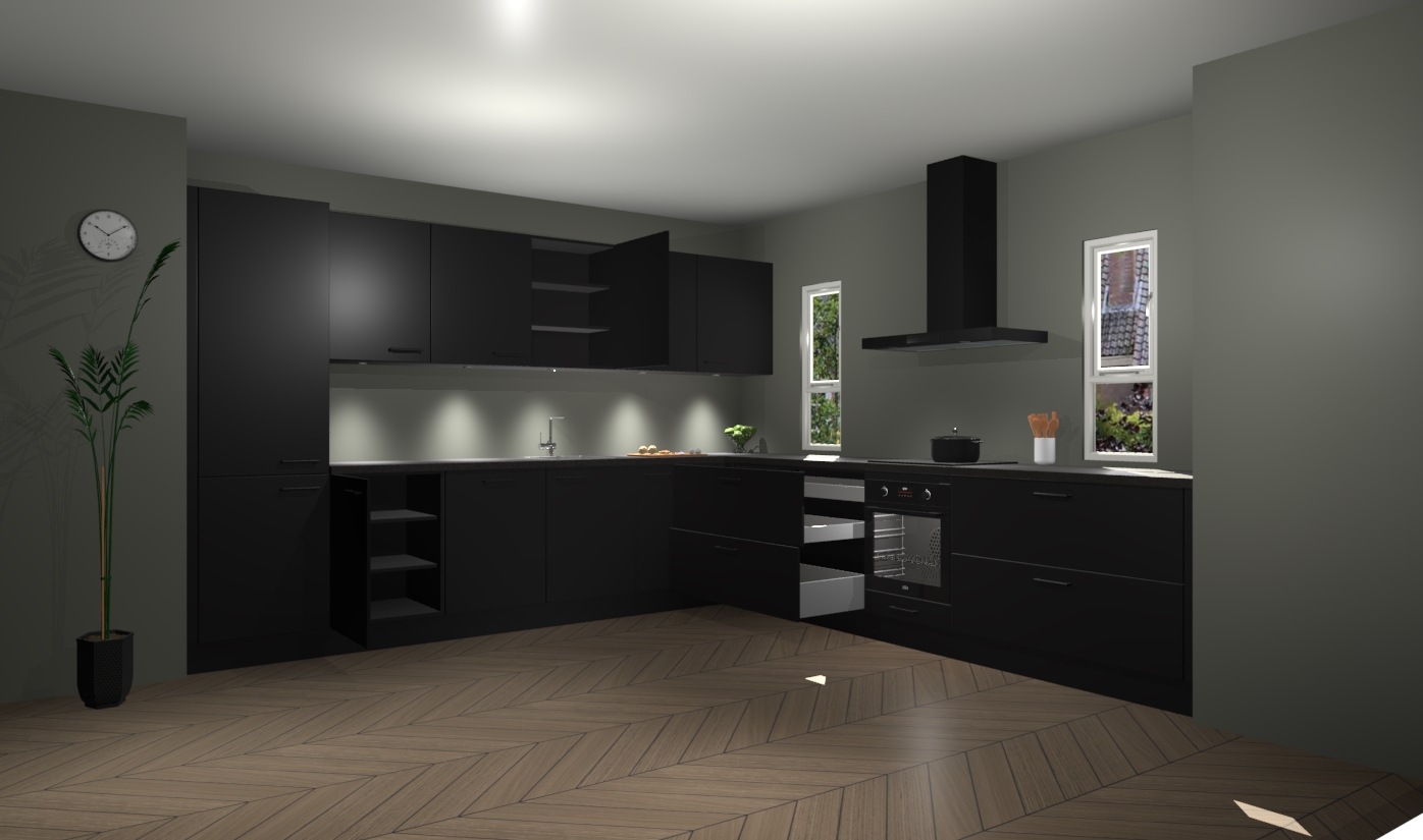 De zwarte keuken is een ideale hoekkeuken en heeft alle functies en apparatuur die u maar nodig kunt hebben. Bij de bestelling krijgt u een oven, inductiekookplaat, afzuigkap, vaatwasser en koelkast - deze kunnen desgewenst eenvoudig worden uitgebreid naar AEG na bestellen. Elke kast wordt ook voor gemonteerd geleverd met soft close deuren die jarenlang gebruik beloven. Stelt u zich voor dat u geen gedoe heeft met vervelende montage - vanaf het moment dat u uw bestelling plaats, duurt het slechts 7 weken voor het bij u thuis geleverd wordt.