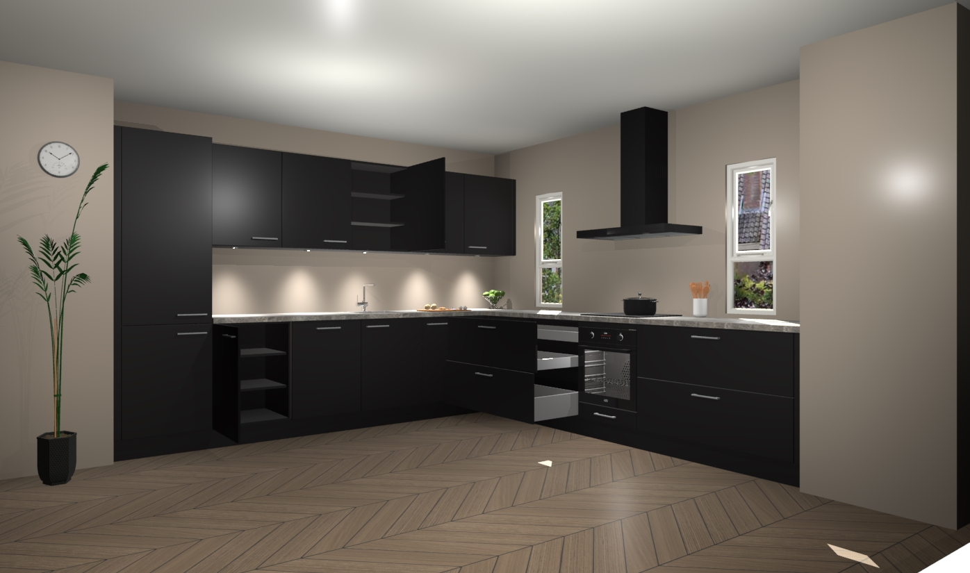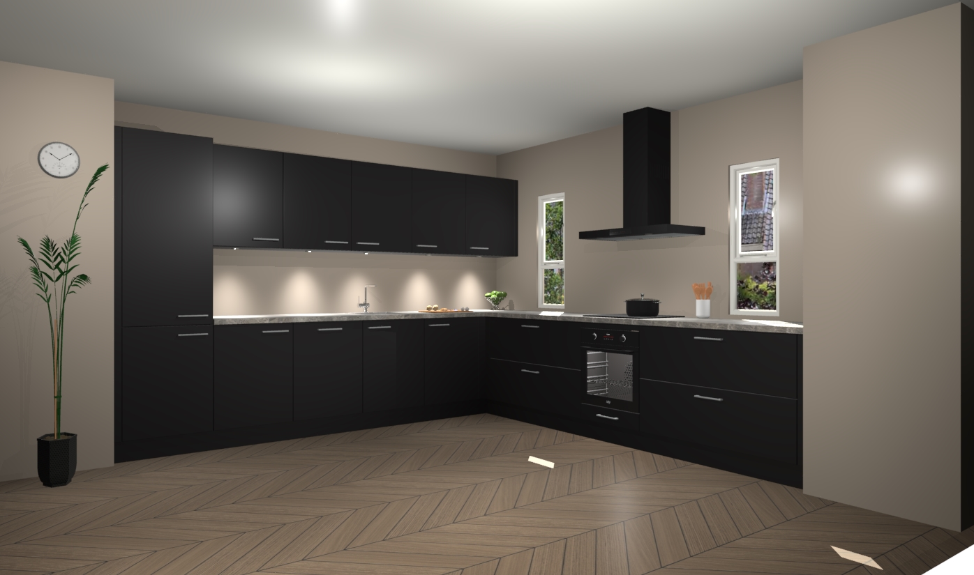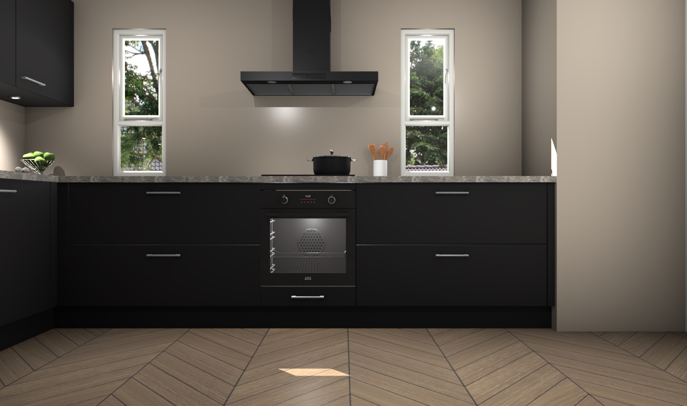 De zwarte keuken is een ideale hoekkeuken en heeft alle functies en apparatuur die u maar nodig kunt hebben. Bij de bestelling krijgt u een oven, inductiekookplaat, afzuigkap, vaatwasser en koelkast - deze kunnen desgewenst eenvoudig worden uitgebreid naar AEG na bestellen. Elke kast wordt ook voor gemonteerd geleverd met soft close deuren die jarenlang gebruik beloven. Stelt u zich voor dat u geen gedoe heeft met vervelende montage - vanaf het moment dat u uw bestelling plaats, duurt het slechts 7 weken voor het bij u thuis geleverd wordt.