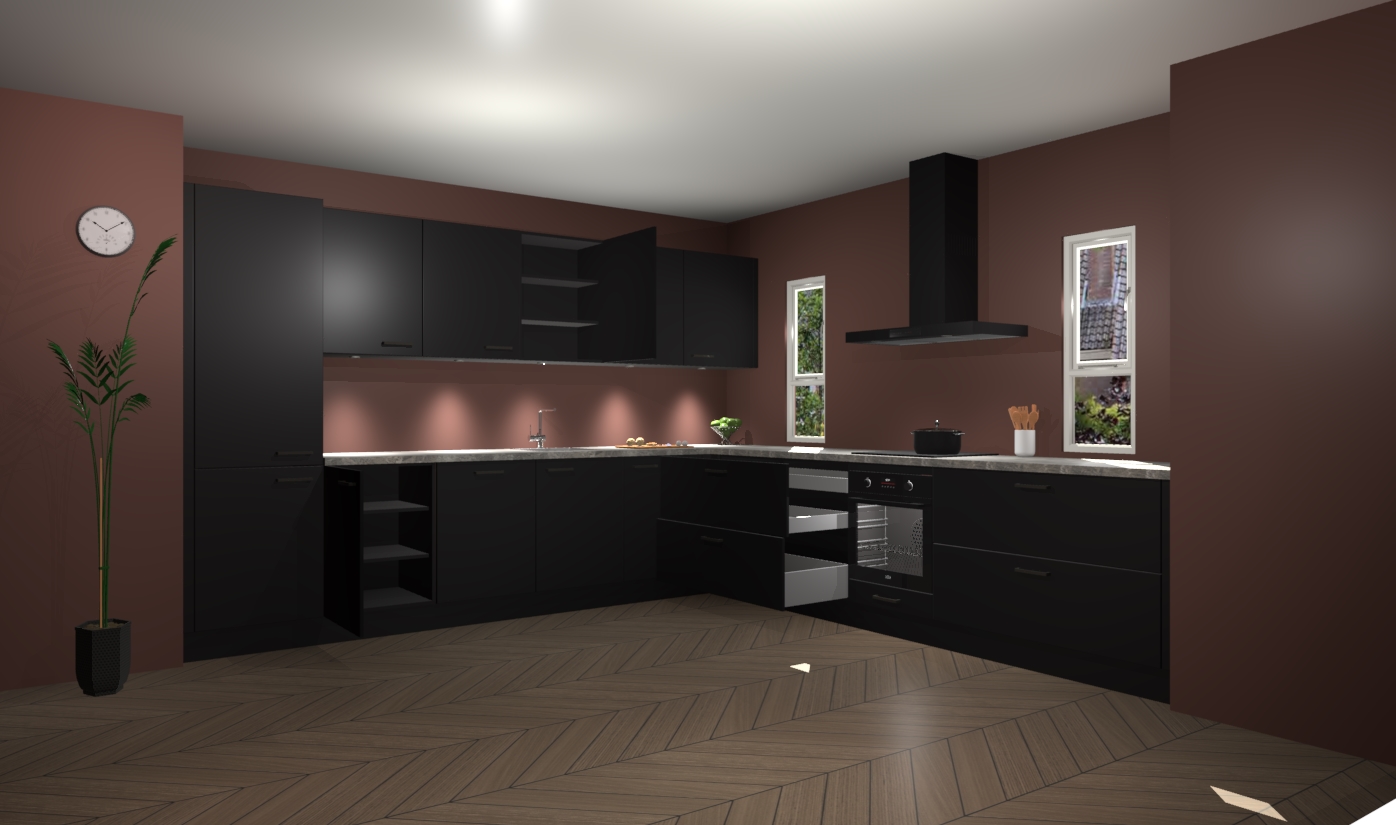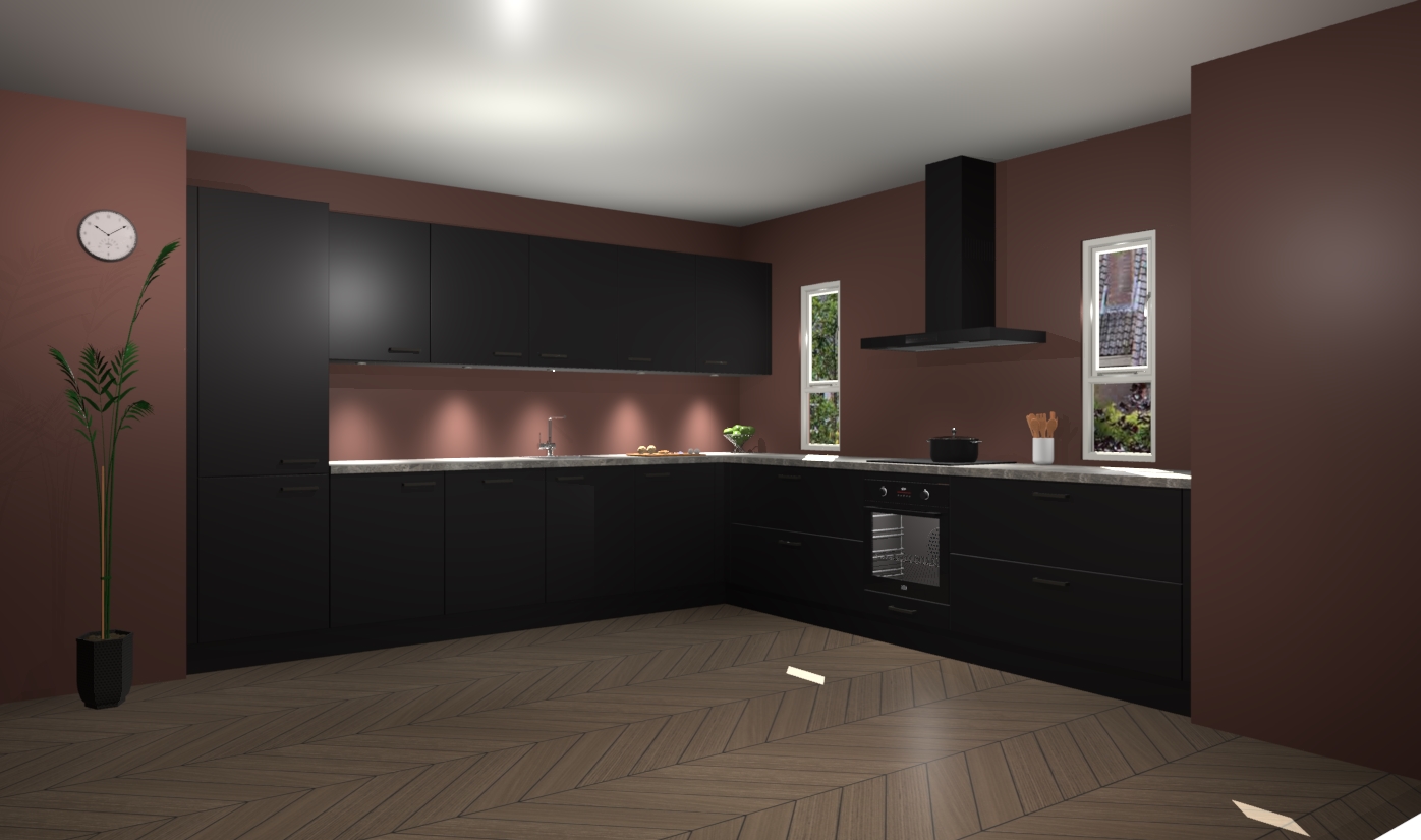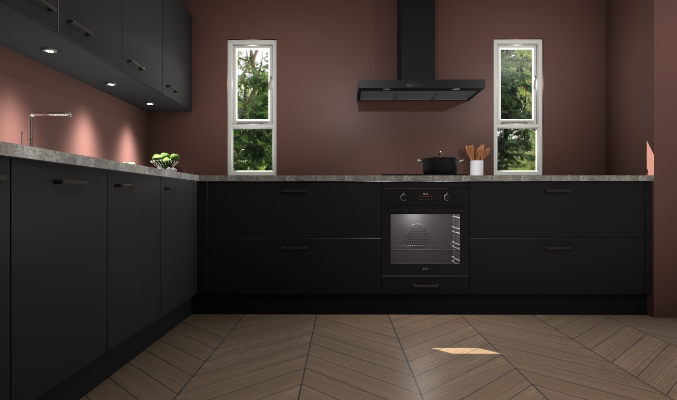 De zwarte keuken is een ideale hoekkeuken en heeft alle functies en apparatuur die u maar nodig kunt hebben. Bij de bestelling krijgt u een oven, inductiekookplaat, afzuigkap, vaatwasser en koelkast - deze kunnen desgewenst eenvoudig worden uitgebreid naar AEG na bestellen. Elke kast wordt ook voor gemonteerd geleverd met soft close deuren die jarenlang gebruik beloven. Stelt u zich voor dat u geen gedoe heeft met vervelende montage - vanaf het moment dat u uw bestelling plaats, duurt het slechts 7 weken voor het bij u thuis geleverd wordt.