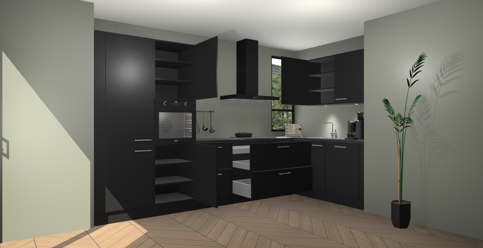 Welkom in uw nieuwe moderne keuken! Laat ons u voorstellen aan de Zwarte keuken Vlaanderen . Deze prachtige hoekkeuken straalt exclusiviteit en luxe uit als geen ander. Het strakke design, de tijdloze kleuren en het model maken van deze keuken een moderne klassieker. En met voldoende opbergruimte heeft deze keuken echt voor ieder wat wils.