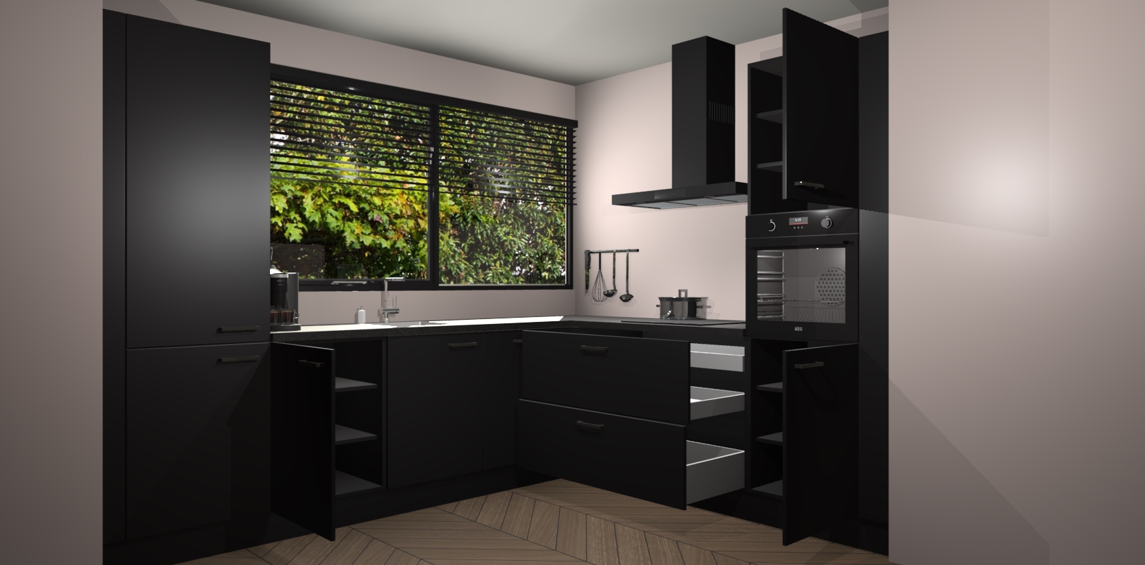Wij presenteren de revolutie in keukens: de zwarte keuken Vogar. Met modern design, een tijdloos uiterlijk en kasten die al voor gemonteerd worden geleverd, laat deze stijlvolle keuken uw kookervaring op een hele nieuwe manier transformeren.