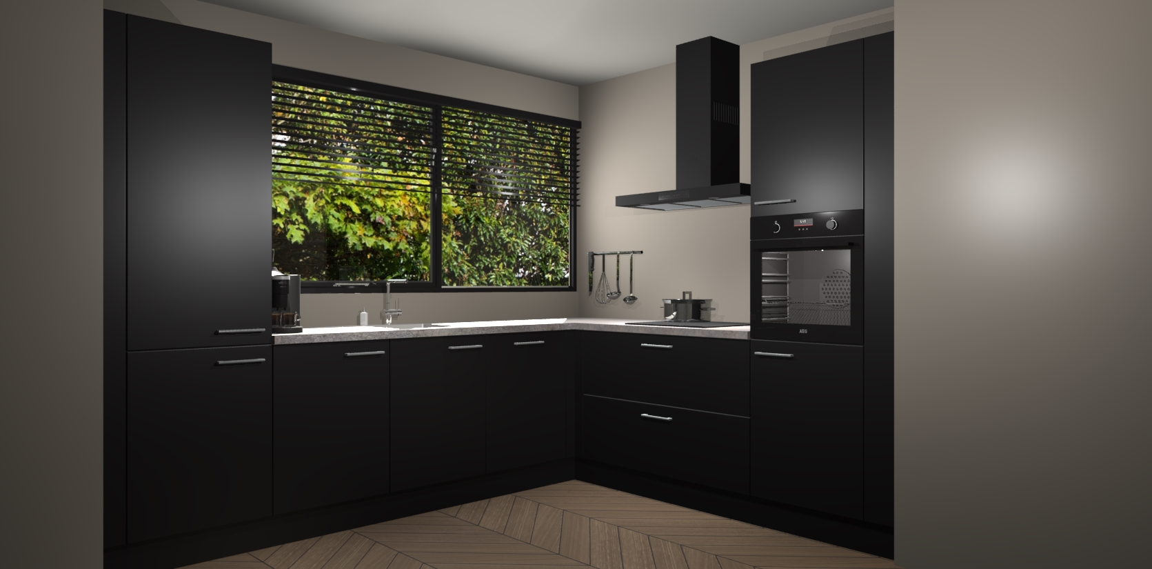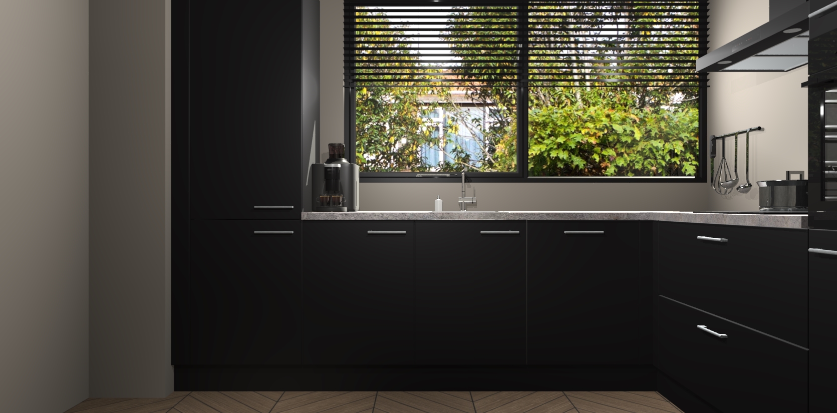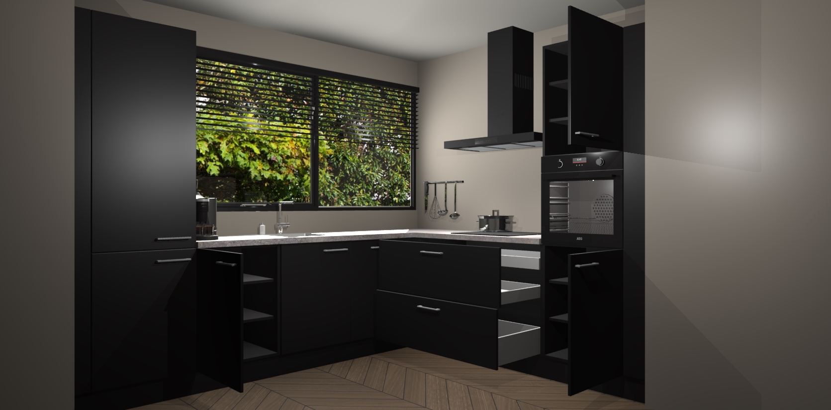 Wij presenteren de revolutie in keukens: de zwarte keuken Vogar. Met modern design, een tijdloos uiterlijk en kasten die al voor gemonteerd worden geleverd, laat deze stijlvolle keuken uw kookervaring op een hele nieuwe manier transformeren.