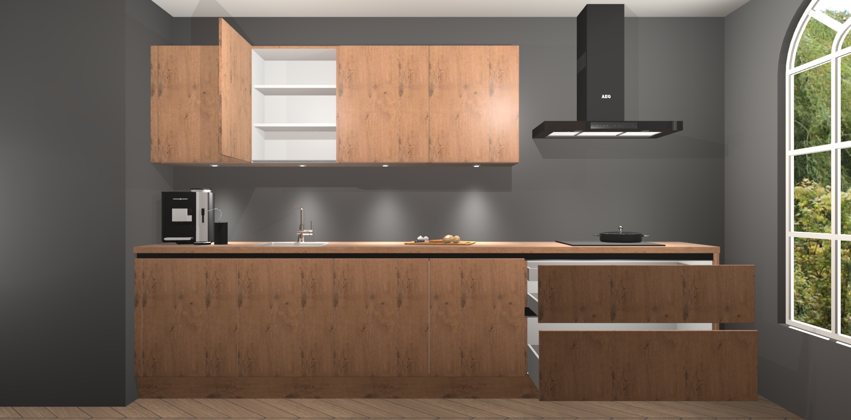 De softclose deuren openen en sluiten is ook heel eenvoudig - geniet van een moeiteloze keukenervaring, zelfs als er kinderen rondlopen. Voor extra gemak bij het plaatsen van uw bestelling bieden we ook een upgrade naar een kookplaat met geïntegreerde afzuiging.