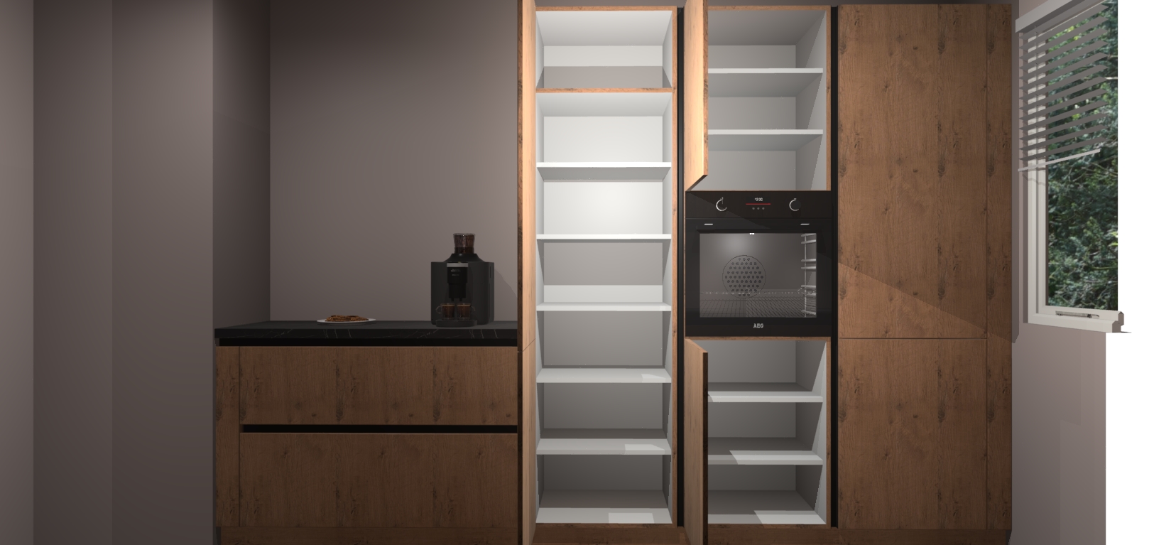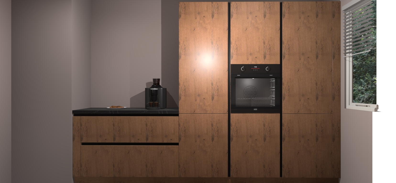 Een stijlvolle en praktische keuken als deze mag gezien worden. Dankzij de prachtige Astoria Eiken matte afwerking wordt de keuken gemakkelijk het middelpunt van uw huis - hij ziet er geweldig uit onder allerlei lichtomstandigheden, van dag tot nacht!