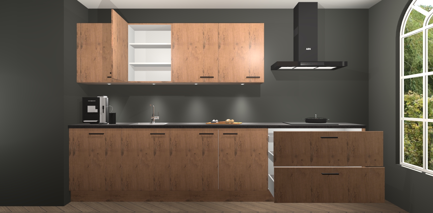 De softclose deuren openen en sluiten is ook heel eenvoudig - geniet van een moeiteloze keukenervaring, zelfs als er kinderen rondlopen. Voor extra gemak bij het plaatsen van uw bestelling bieden we ook een upgrade naar een kookplaat met geïntegreerde afzuiging.