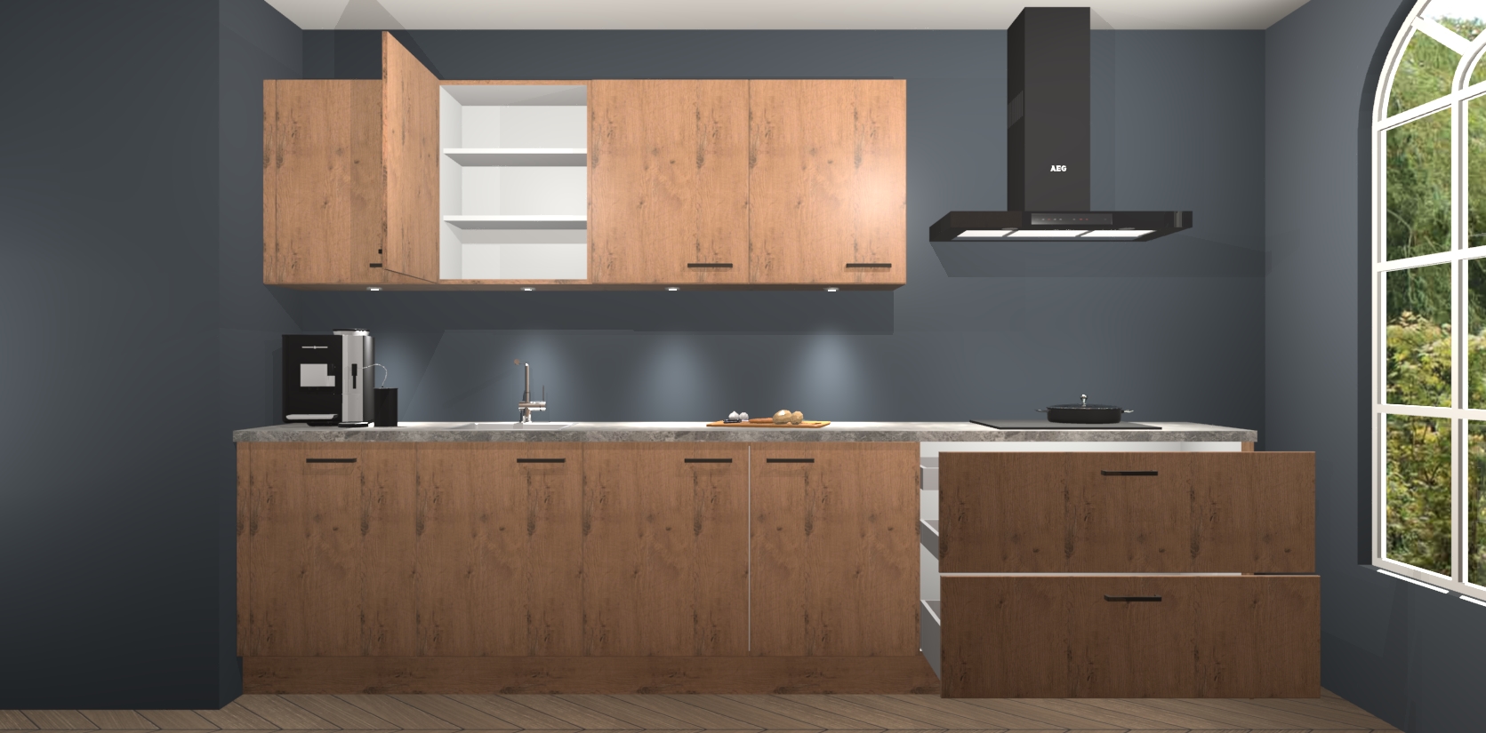 De softclose deuren openen en sluiten is ook heel eenvoudig - geniet van een moeiteloze keukenervaring, zelfs als er kinderen rondlopen. Voor extra gemak bij het plaatsen van uw bestelling bieden we ook een upgrade naar een kookplaat met geïntegreerde afzuiging.