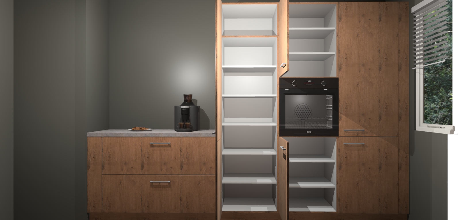 Een stijlvolle en praktische keuken als deze mag gezien worden. Dankzij de prachtige Astoria Eiken matte afwerking wordt de keuken gemakkelijk het middelpunt van uw huis - hij ziet er geweldig uit onder allerlei lichtomstandigheden, van dag tot nacht!
