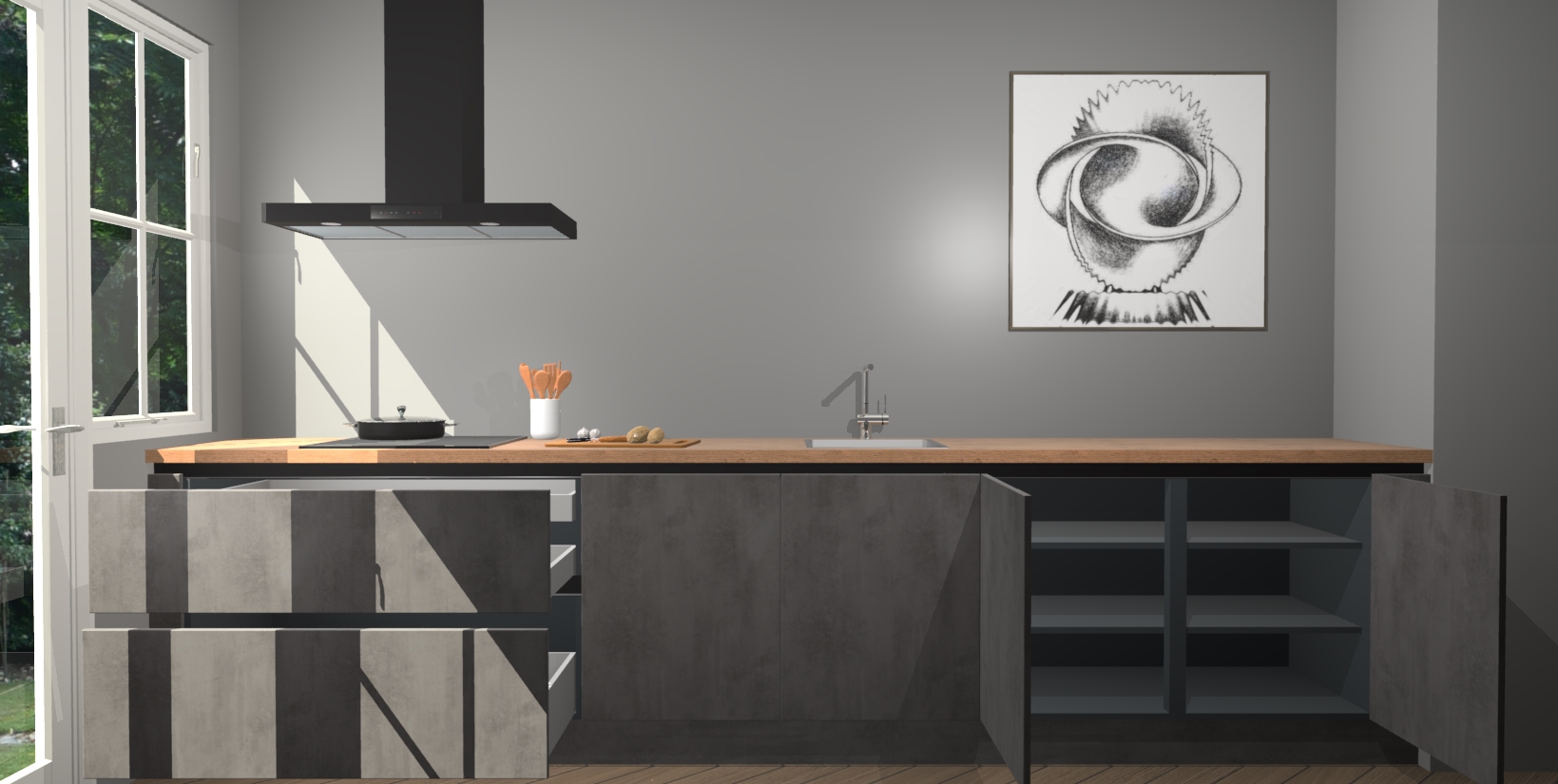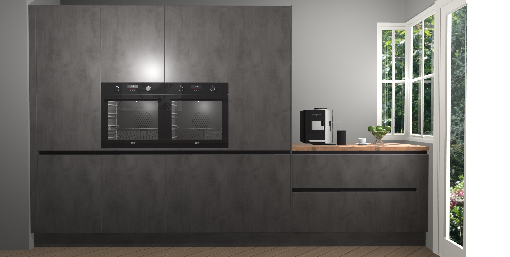 Een stijlvolle en praktische keuken als deze mag gezien worden. Dankzij de prachtige beton antraciet matte afwerking wordt de keuken gemakkelijk het middelpunt van uw huis - hij ziet er geweldig uit onder allerlei lichtomstandigheden, van dag tot nacht!