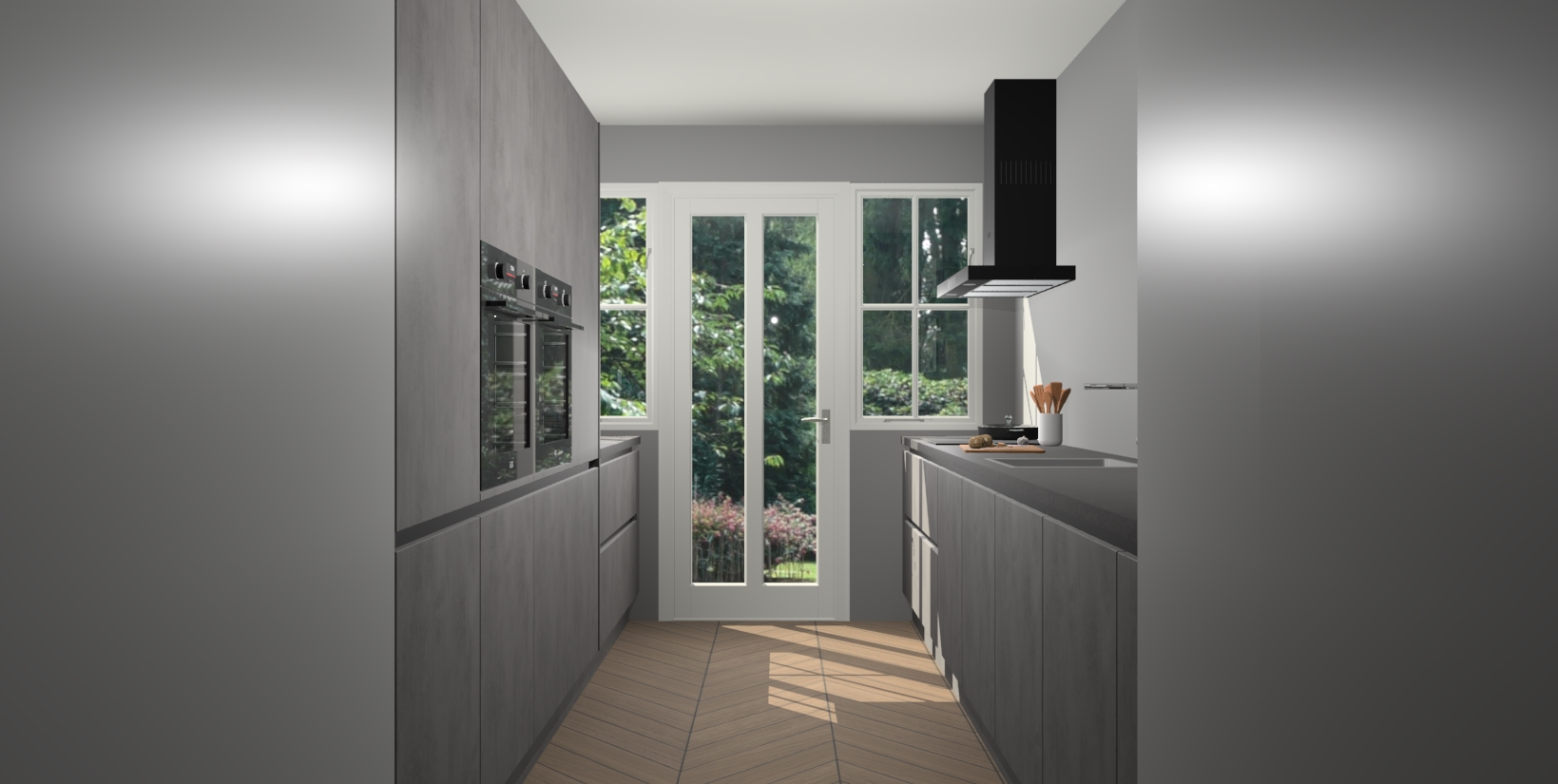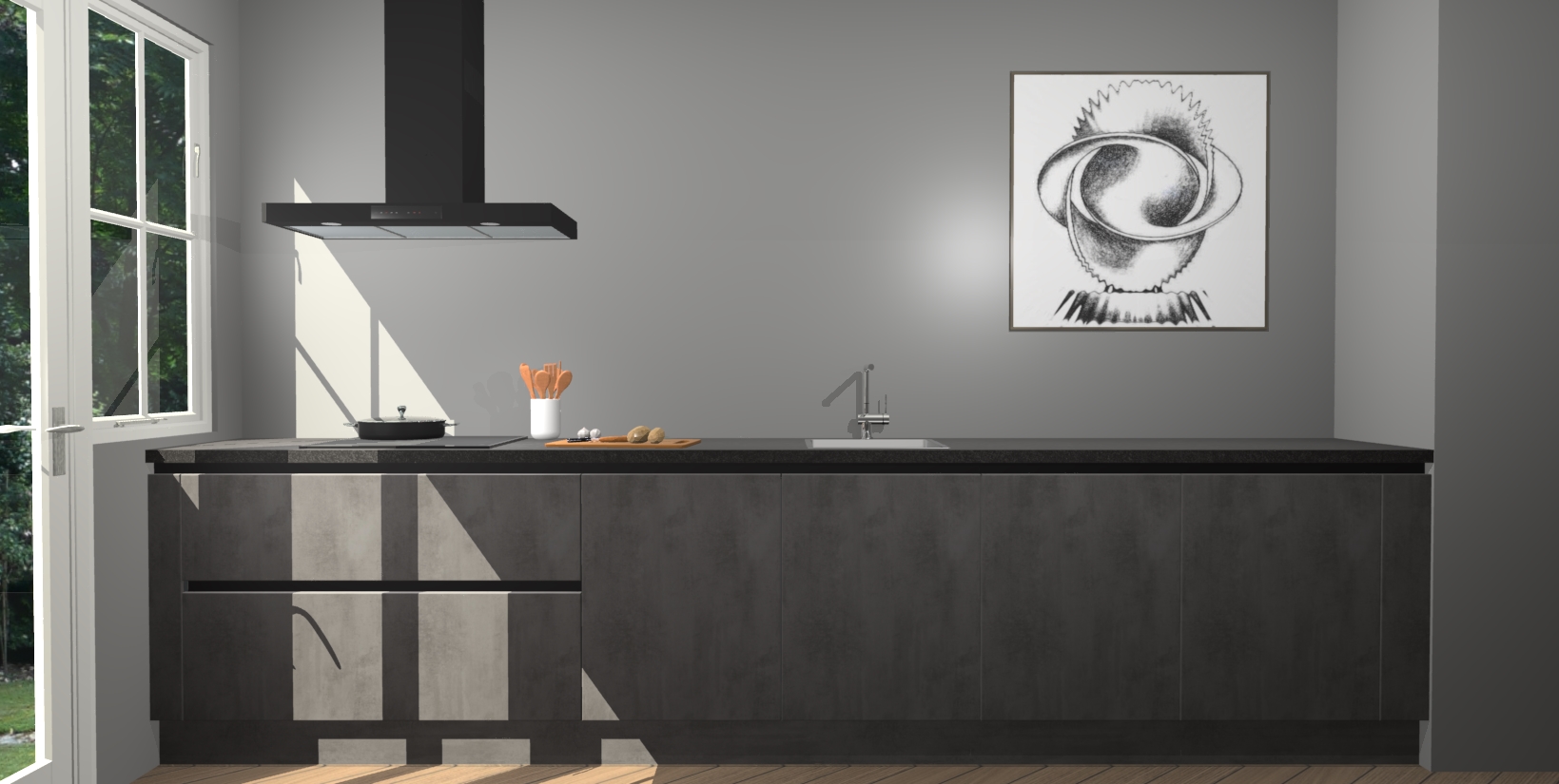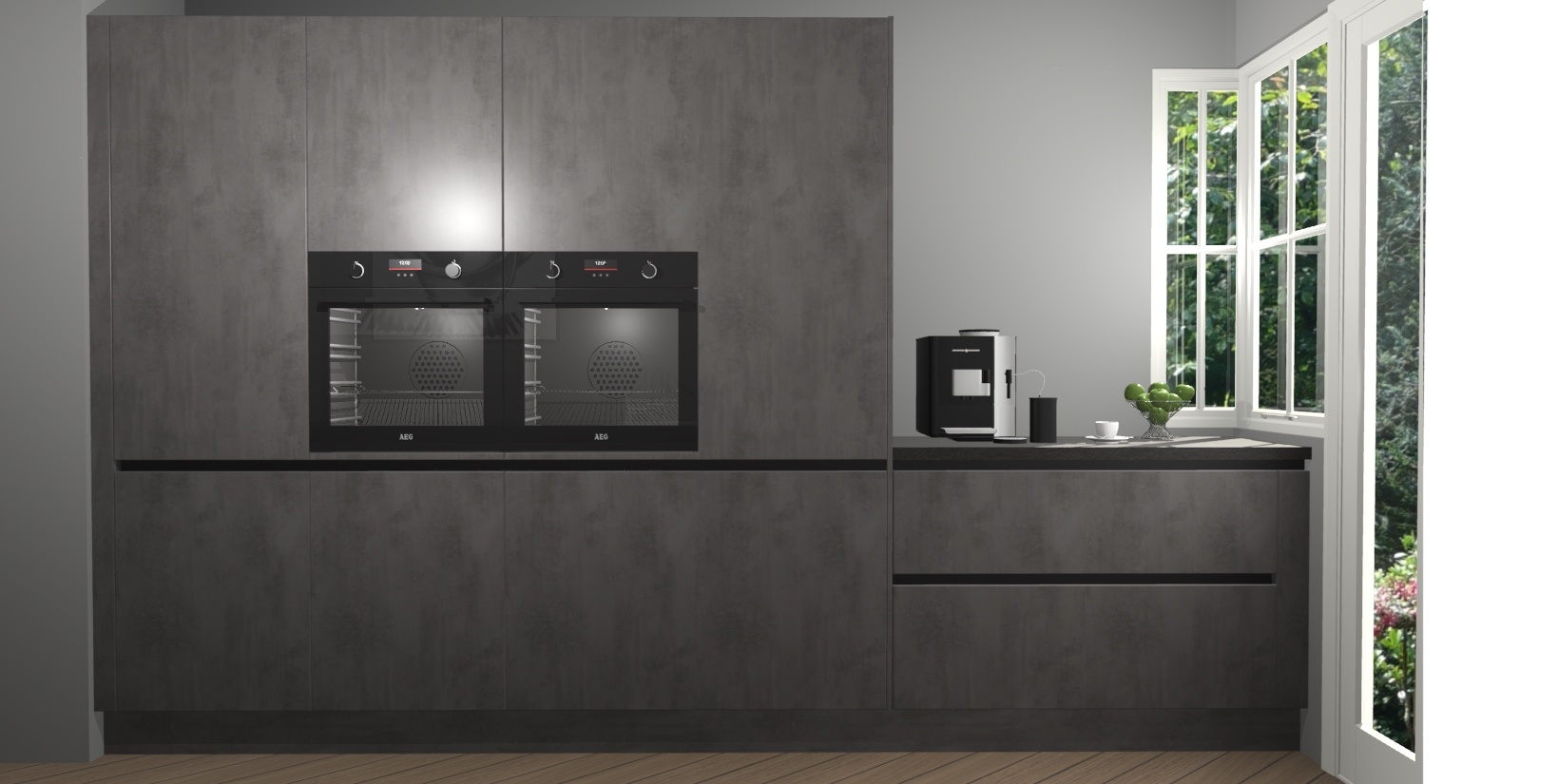 Een stijlvolle en praktische keuken als deze mag gezien worden. Dankzij de prachtige beton antraciet matte afwerking wordt de keuken gemakkelijk het middelpunt van uw huis - hij ziet er geweldig uit onder allerlei lichtomstandigheden, van dag tot nacht!