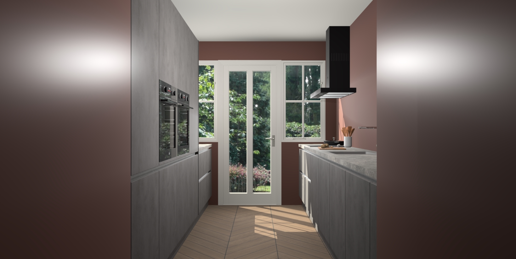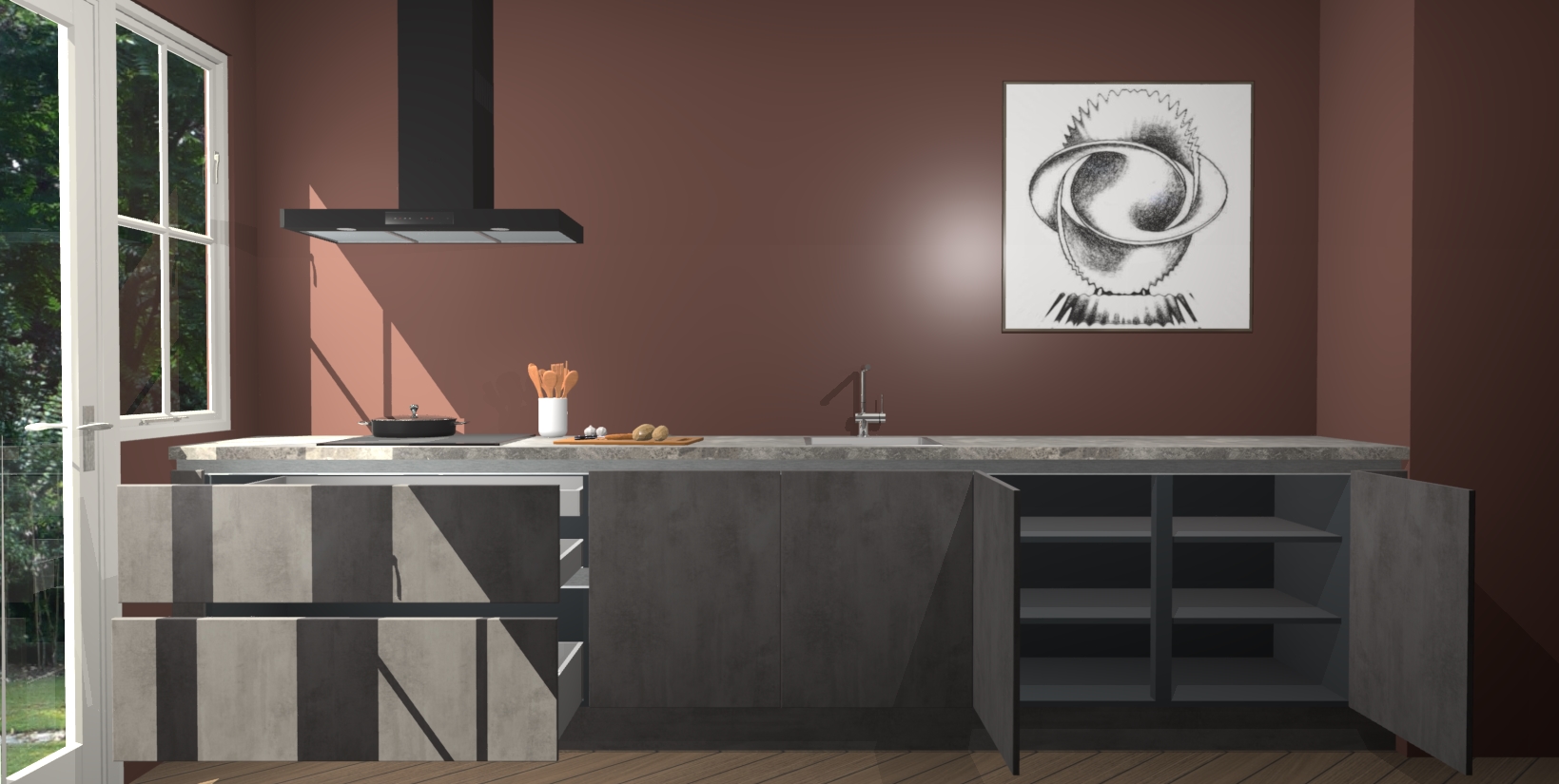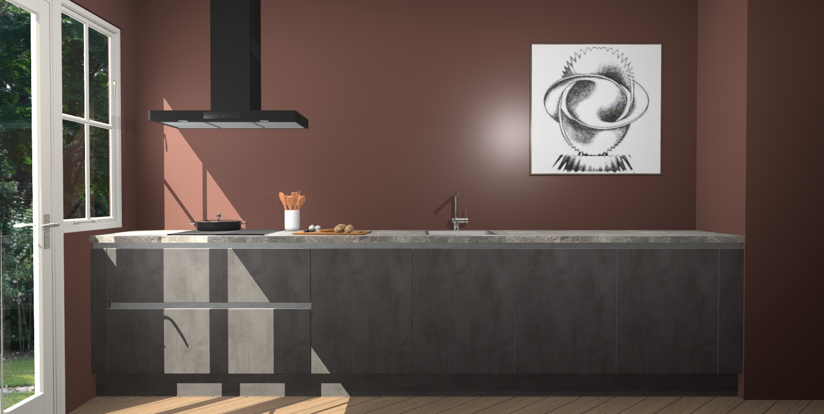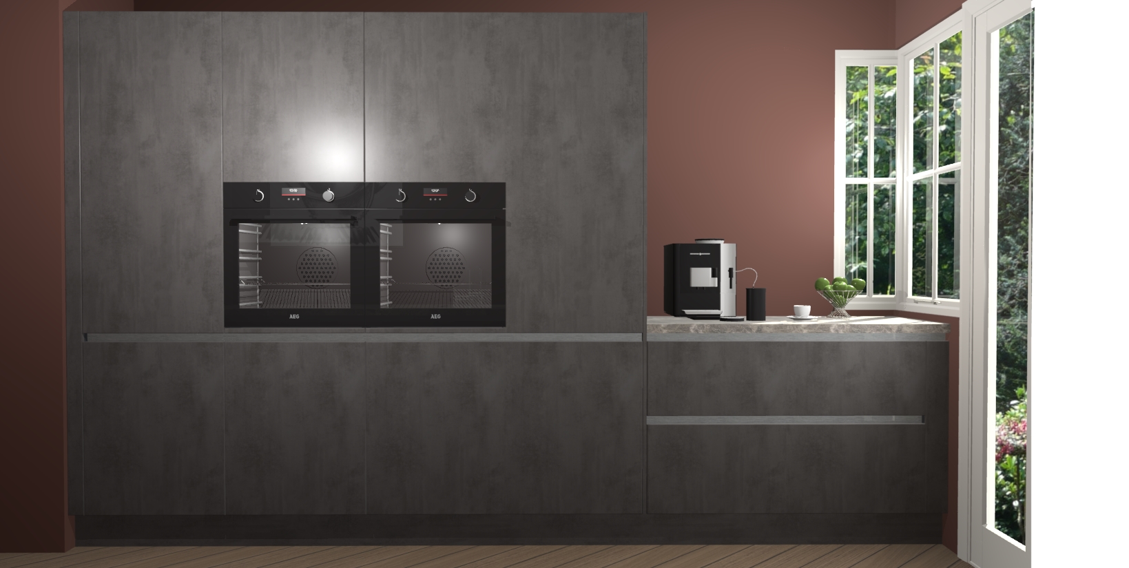 Een stijlvolle en praktische keuken als deze mag gezien worden. Dankzij de prachtige beton antraciet matte afwerking wordt de keuken gemakkelijk het middelpunt van uw huis - hij ziet er geweldig uit onder allerlei lichtomstandigheden, van dag tot nacht!